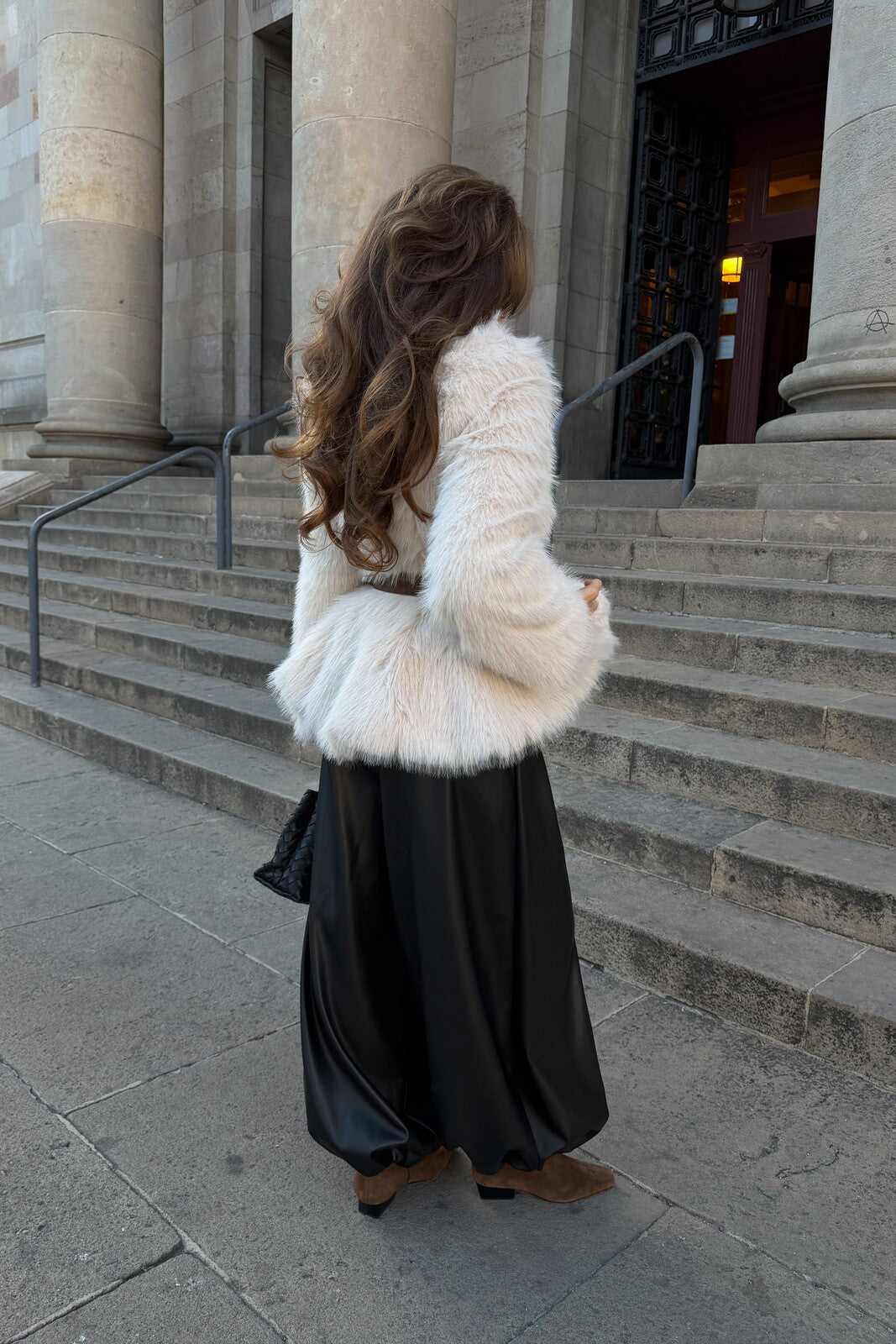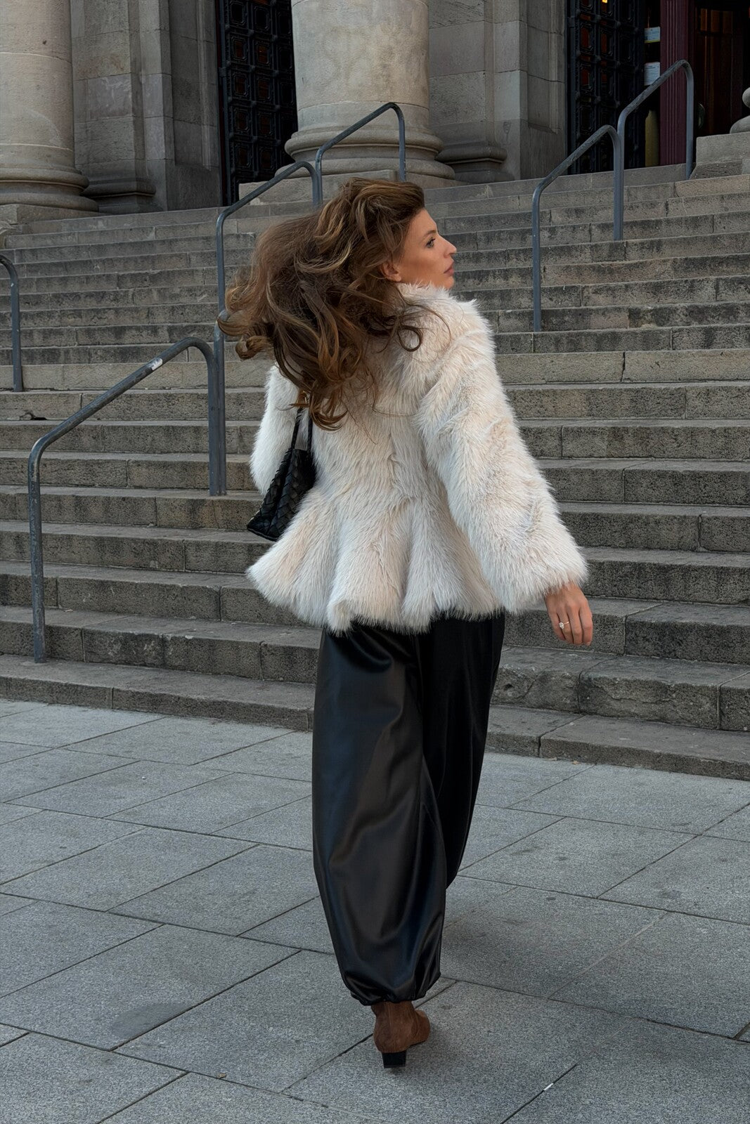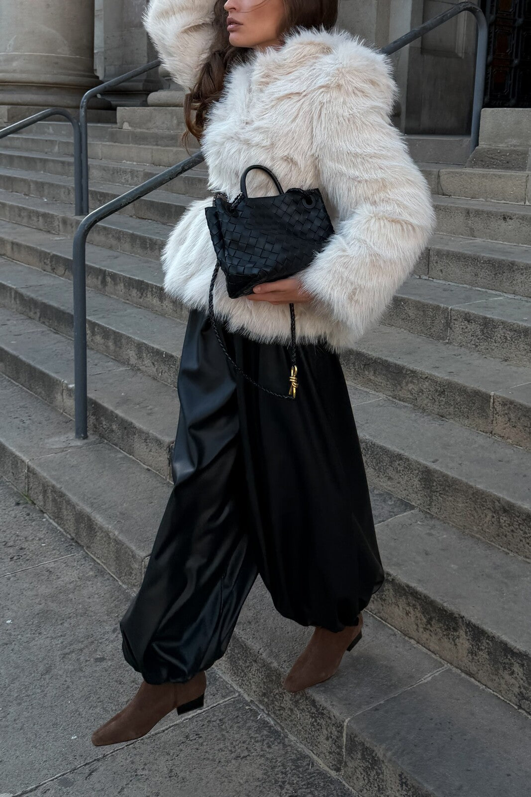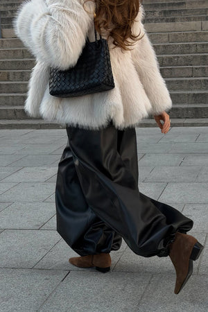 Estas calças pretas cardadas em efeito pele, uma peça ousada que combina conforto e estilo contemporâneo. Com um design amplo e estruturado, criam um movimento elegante a cada passo, enquanto o acabamento acetinado acrescenta sofisticação. A cintura subida com elástico ajustável garante máximo conforto e um ajuste perfeito. O detalhe cardado na zona inferior confere volume harmonioso, tornando-as ideais para composições modernas e cheias de personalidade. Perfeitas para usar com malhas, casacos statement e botas.