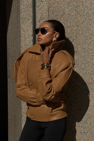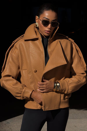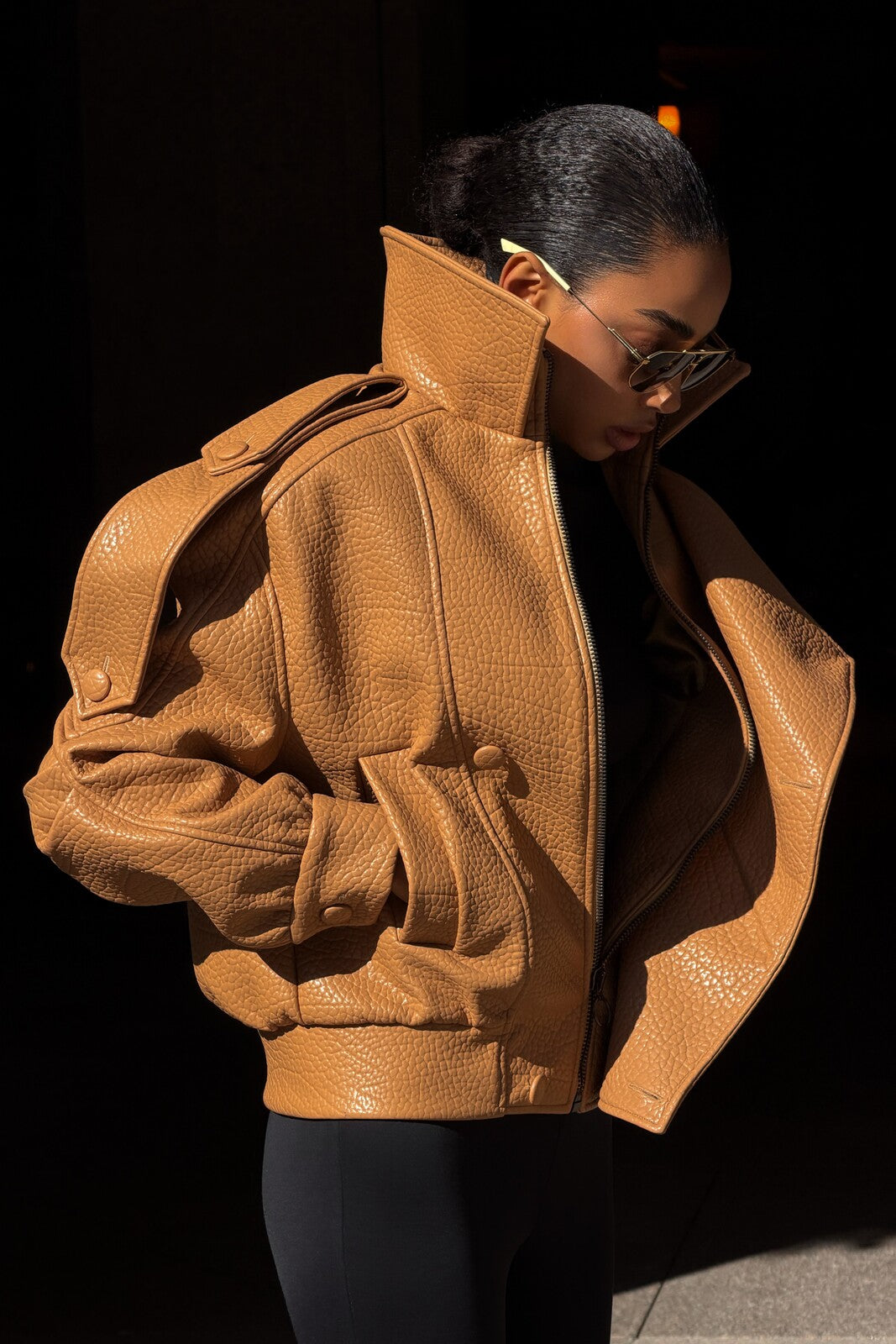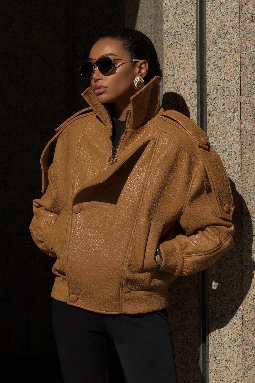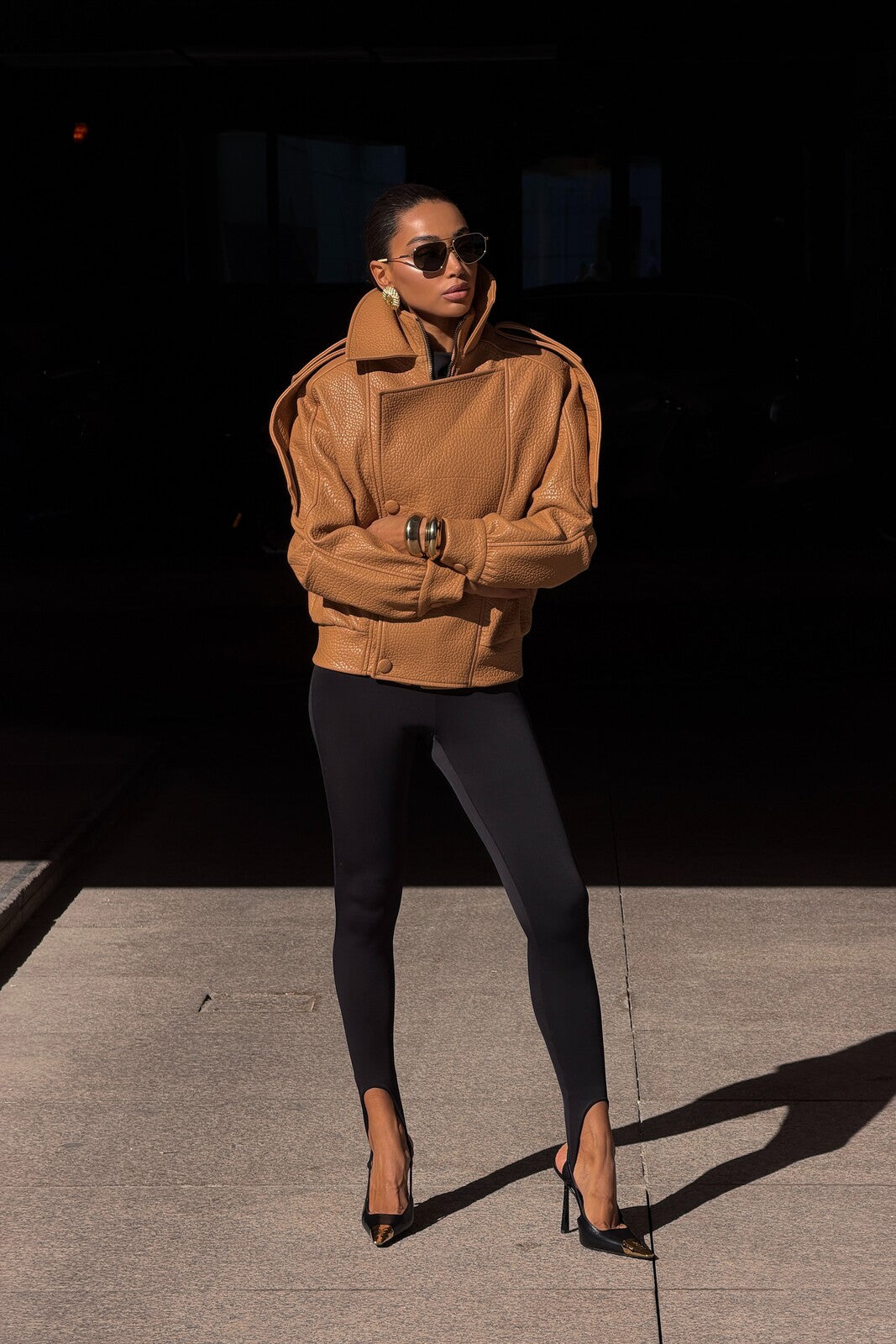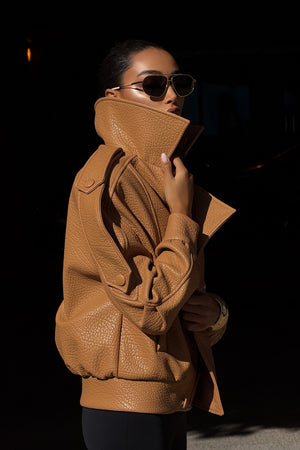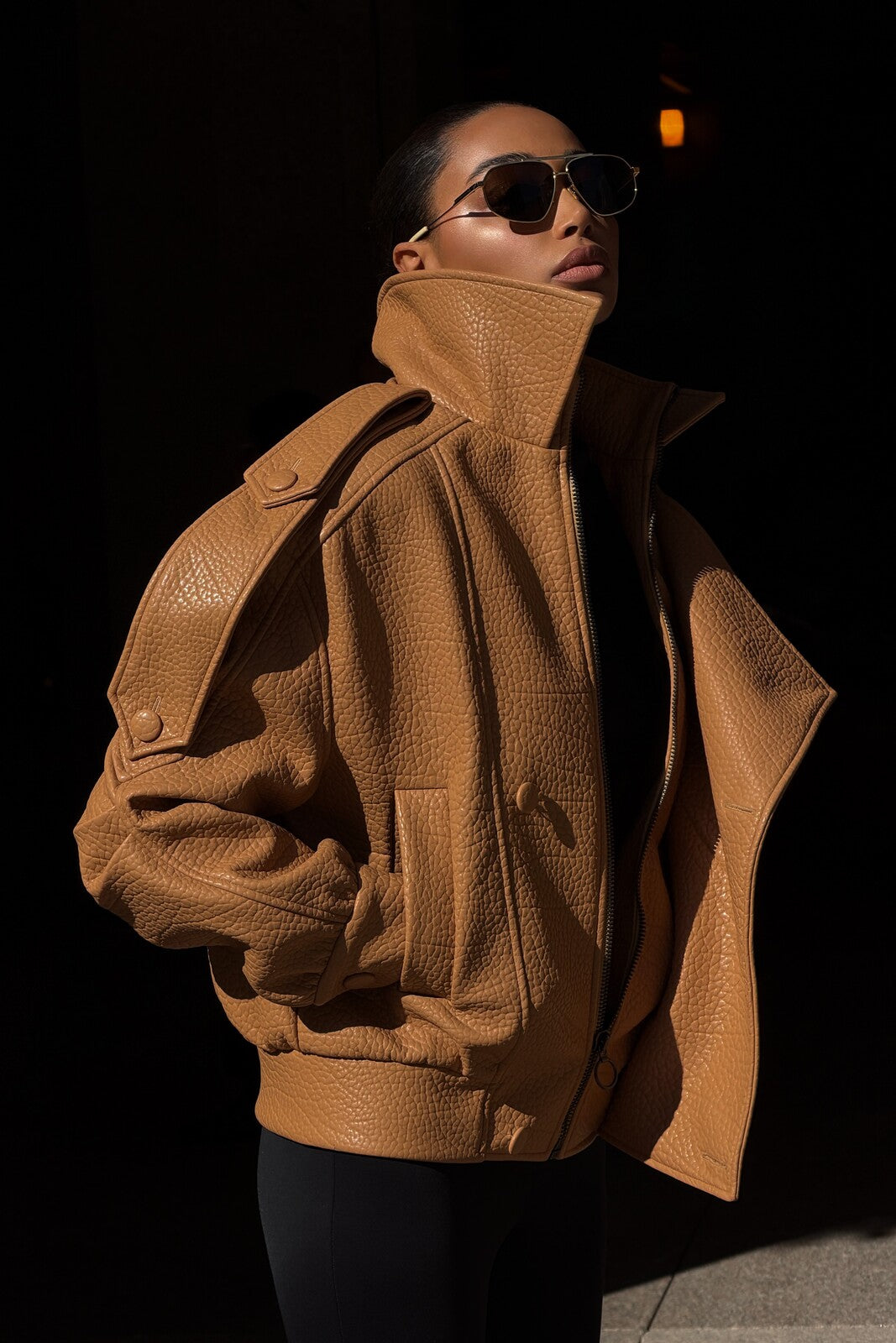 O casaco biker porcini é uma peça statement que eleva qualquer look. Confeccionado em material com efeito pele de alta qualidade, o modelo apresenta estrutura moderna com gola alta, ombros marcados e fechamento frontal assimétrico, conferindo um ar contemporâneo e poderoso. O acabamento acetinado adiciona profundidade e elegância ao tom porcini, tornando-o ideal tanto para composições casuais com jeans quanto para produções fashionistas com saias ou vestidos rendados.