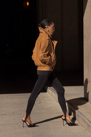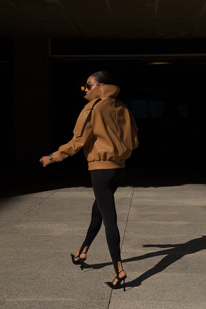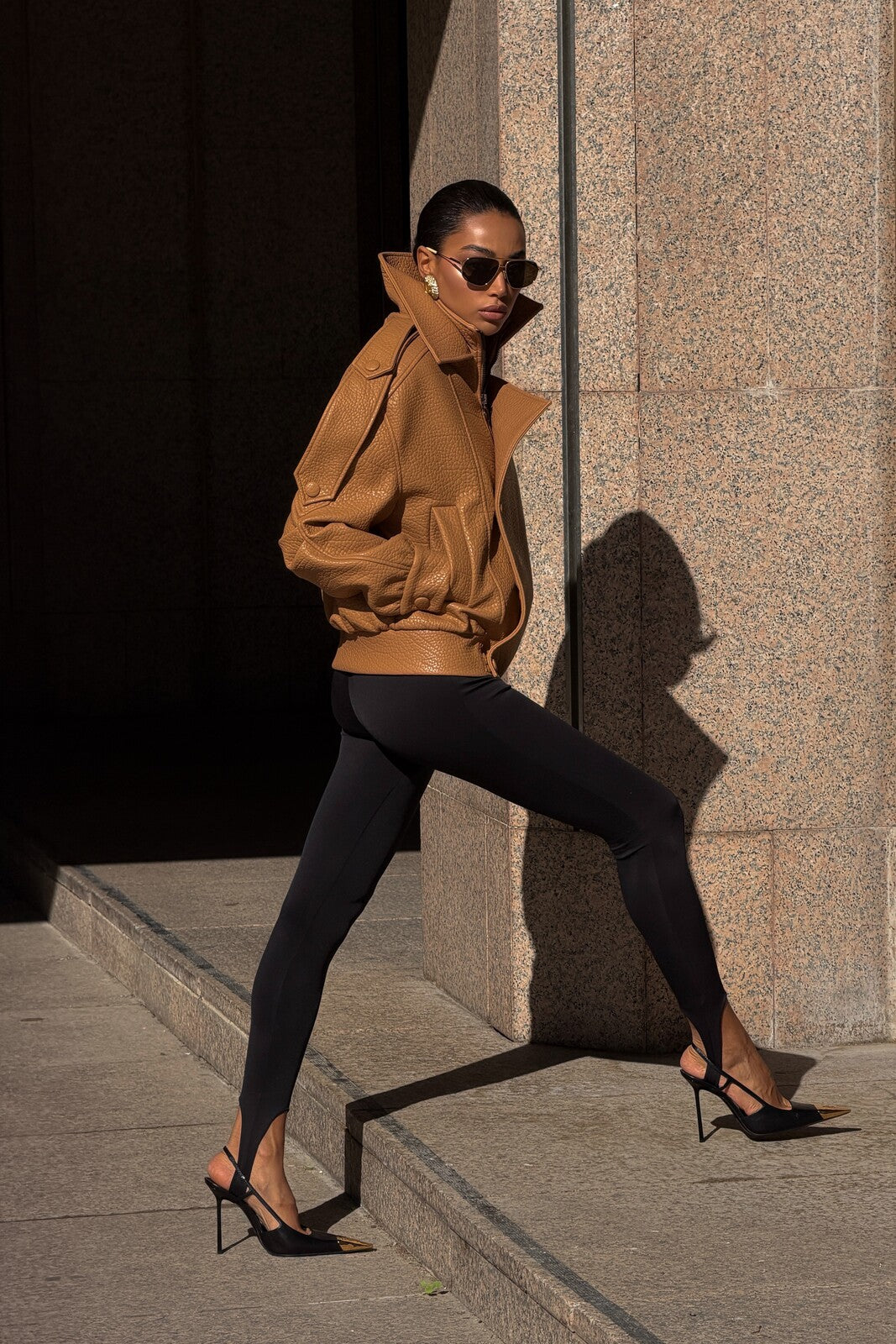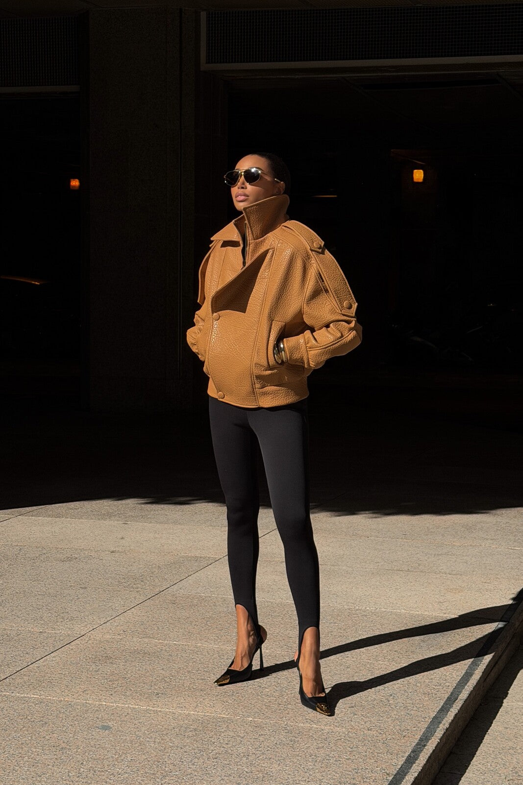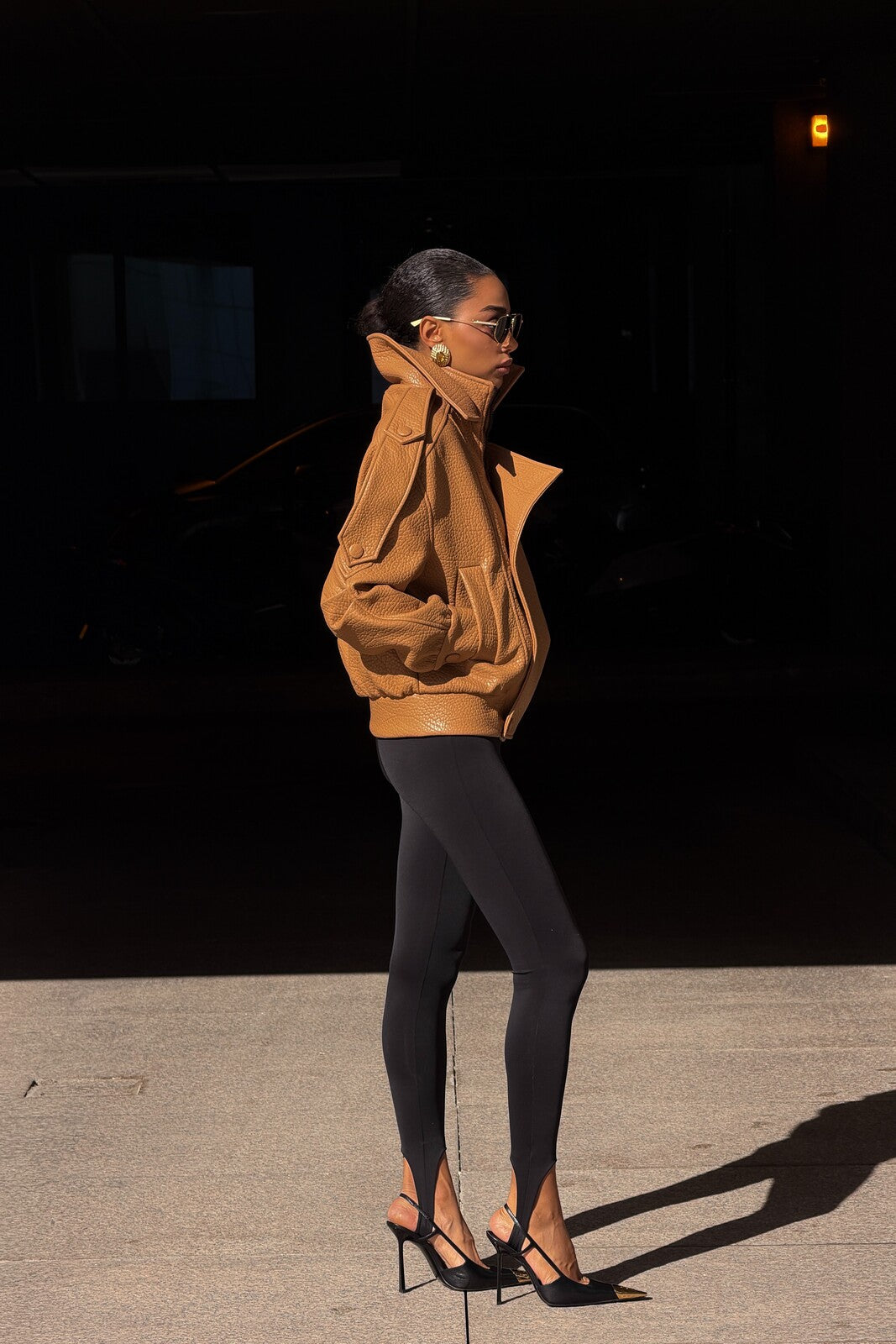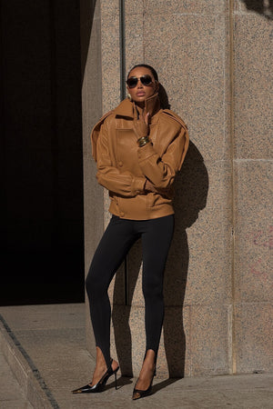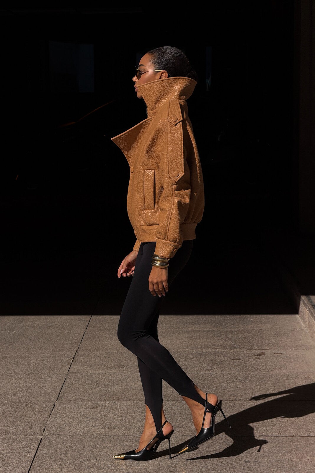 O casaco biker porcini é uma peça statement que eleva qualquer look. Confeccionado em material com efeito pele de alta qualidade, o modelo apresenta estrutura moderna com gola alta, ombros marcados e fechamento frontal assimétrico, conferindo um ar contemporâneo e poderoso. O acabamento acetinado adiciona profundidade e elegância ao tom porcini, tornando-o ideal tanto para composições casuais com jeans quanto para produções fashionistas com saias ou vestidos rendados.