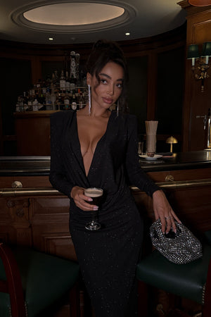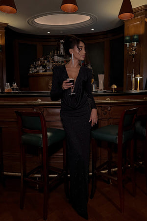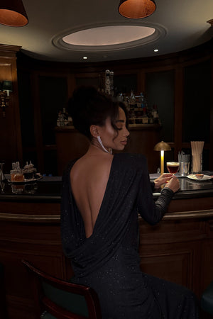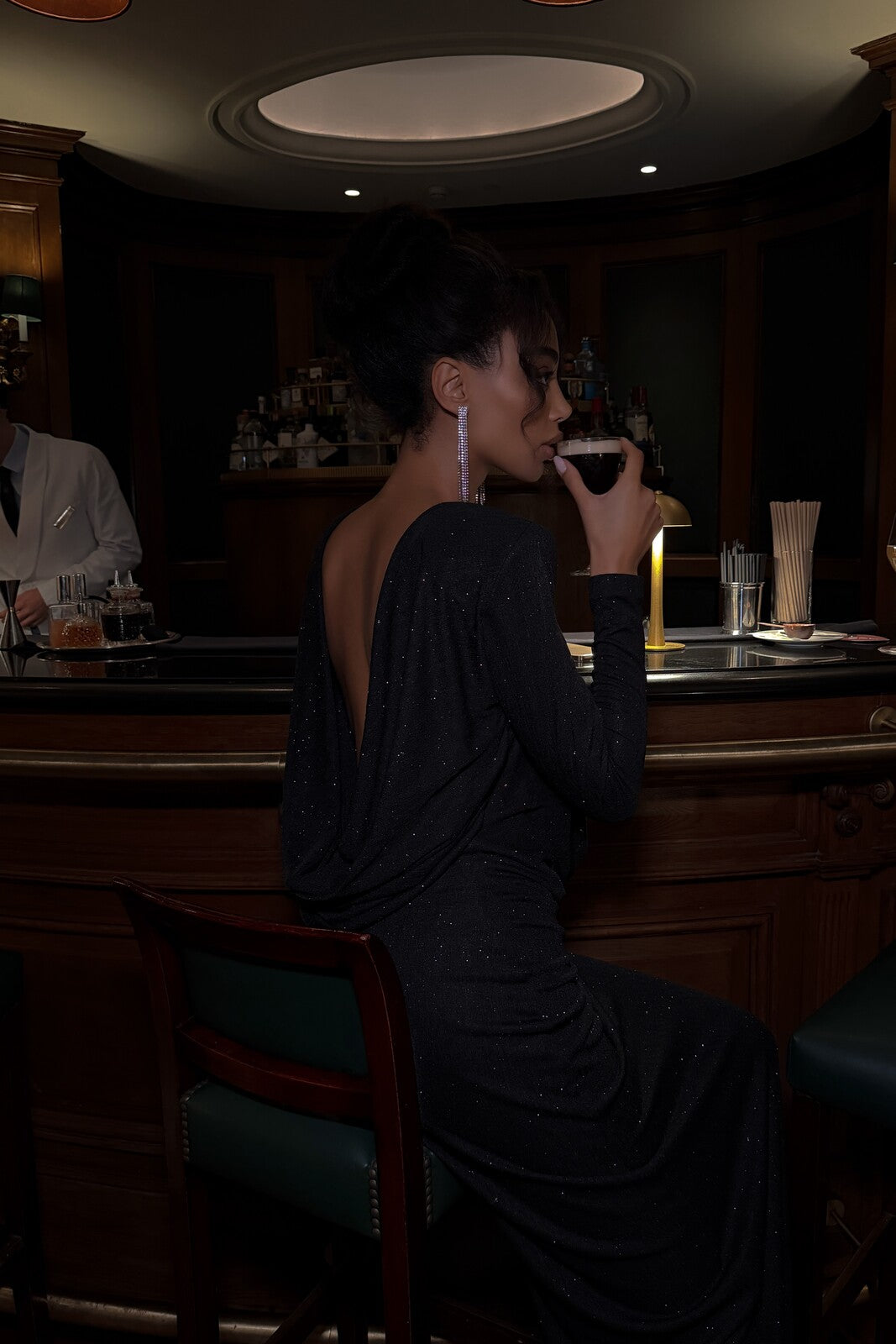 Desenvolvido para noites especiais, este vestido preto longo combina sofisticação e sensualidade de forma equilibrada. O destaque fica por conta das costas drapeadas profundamente abertas, criando um efeito fluido que valoriza a silhueta com elegância. Confeccionado num tecido leve com brilho subtil, apresenta um caimento impecável que alonga a figura. A frente possui decote cruzado e mangas compridas, equilibrando o design marcante das costas. O detalhe de franzidos estratégicos proporciona um ajuste confortável e favorecedor. Um modelo impactante para eventos, jantares e ocasiões onde a sofisticação é essencial.