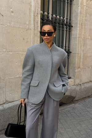 Structured grey wool coat where minimalist elegance meets contemporary sophistication. With a straight silhouette and subtly defined shoulders, it features a high collar and a discreet front closure, creating a clean and refined line. Flap pockets and an impeccable finish enhance its timeless character, while the high-quality wool fabric ensures thermal comfort and a flawless drape. Ideal for sophisticated urban compositions, from classic tailoring to more modern coordinated looks.