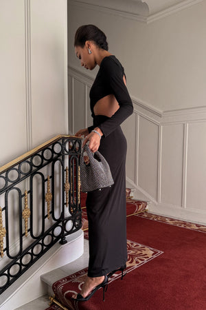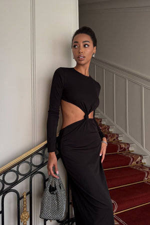 The long black dress with strategic cut-outs and a front knot detail is the ideal choice for women who value elegance with a bold touch. The piece features a body-hugging fit that highlights the curves in a sophisticated way, with ankle-length finish. The knot detail at the front enhances the waist, while the side cut-outs and discreet neckline create a modern and impactful look. Made from comfortable fabric, this dress combines sensuality and class, making it perfect for evening events, parties, or special occasions that call for a strong presence. The long sleeves balance the look, making it versatile across seasons. A timeless dress that blends minimalism and style, ideal for bold statements with subtle or daring accessories.