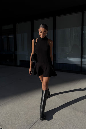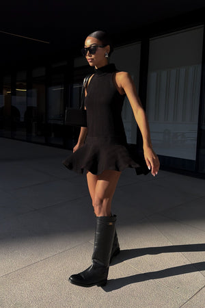 Modern and sophisticated, this short black dress blends minimalist elegance with a contemporary touch. Crafted from a textured fabric with a subtle chevron pattern, it features a fitted upper part and a lightly flared skirt that adds movement and femininity. The sleeveless design and structured high neckline bring attitude and refinement, making it a versatile piece for day or night.