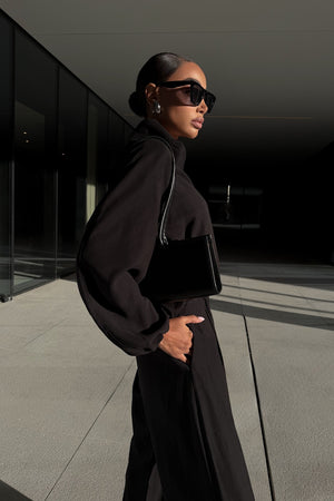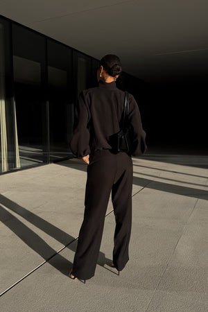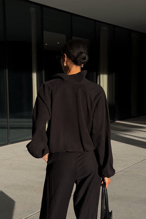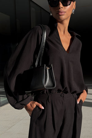 Sophisticated, lightweight, and timeless — this black cupro blouse is the definition of relaxed elegance. With a fluid cut and open collar, it creates a subtle neckline that enhances the décolleté in an elegant way. The wide sleeves with elastic cuffs add a contemporary touch and natural movement, while the premium cupro fabric offers a soft, cool texture with a silky feel.