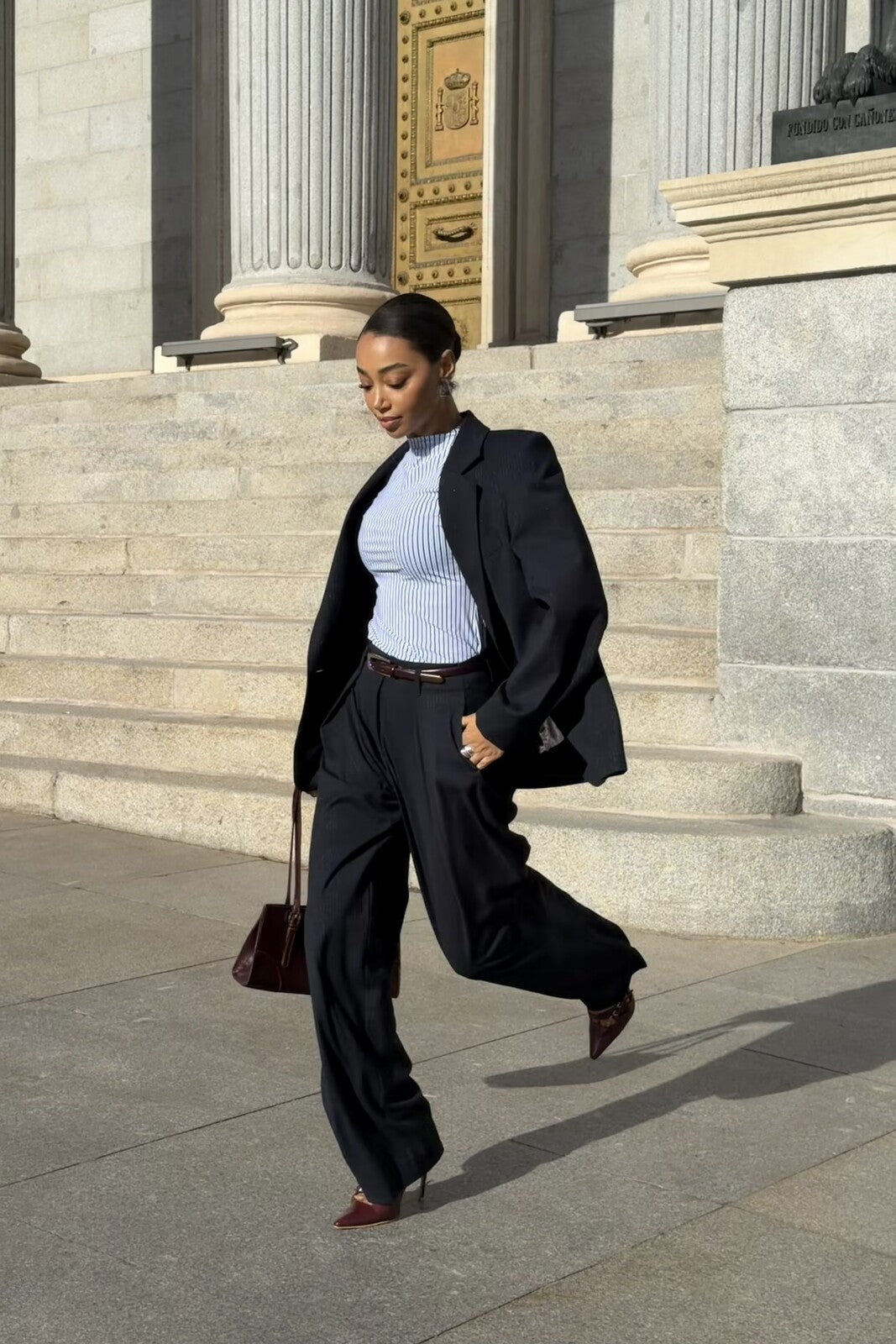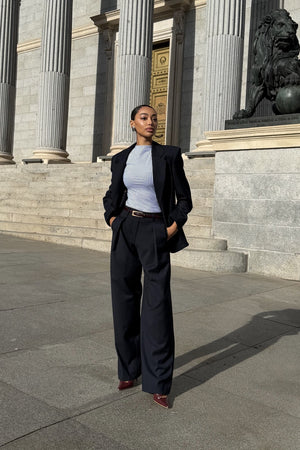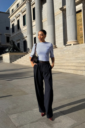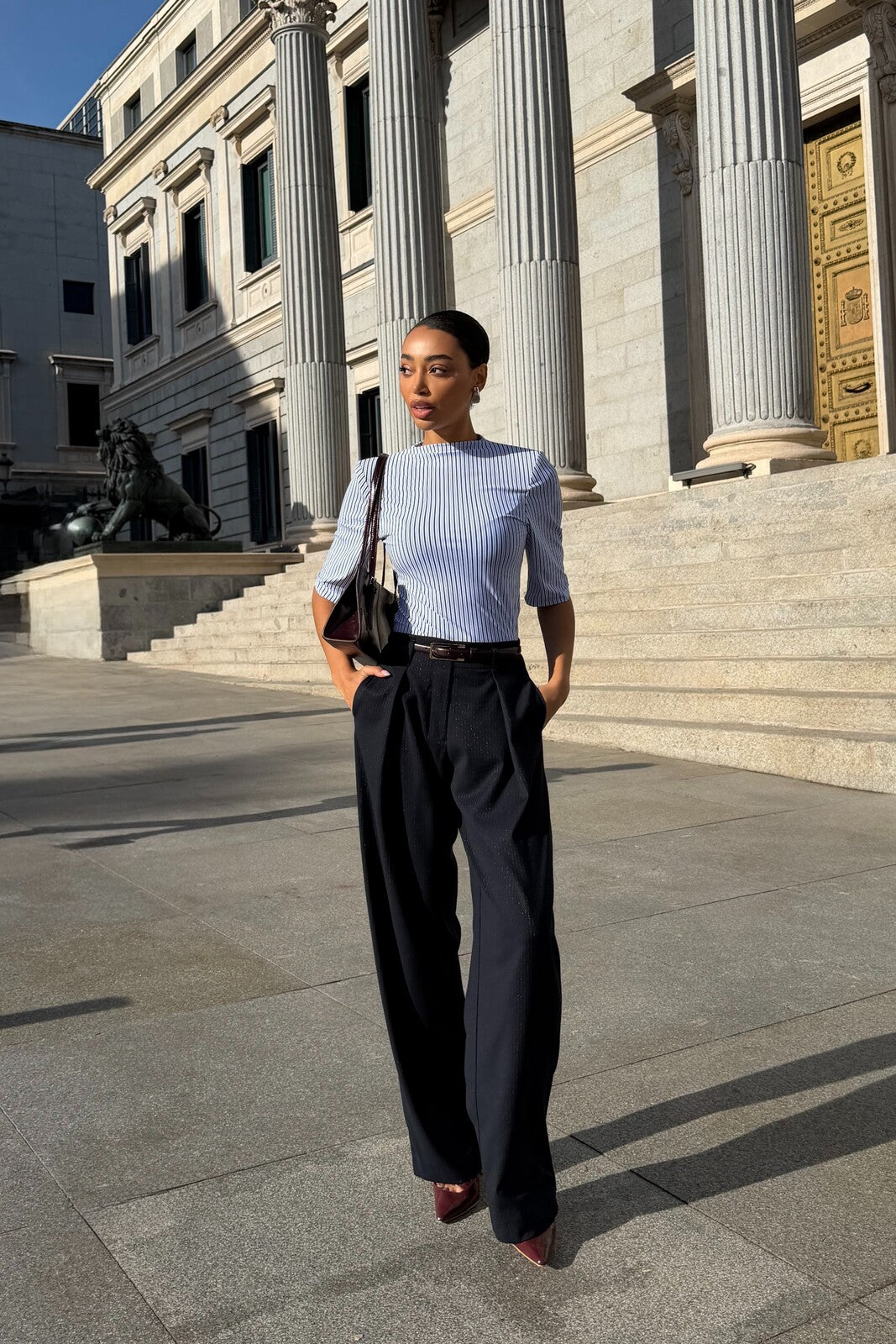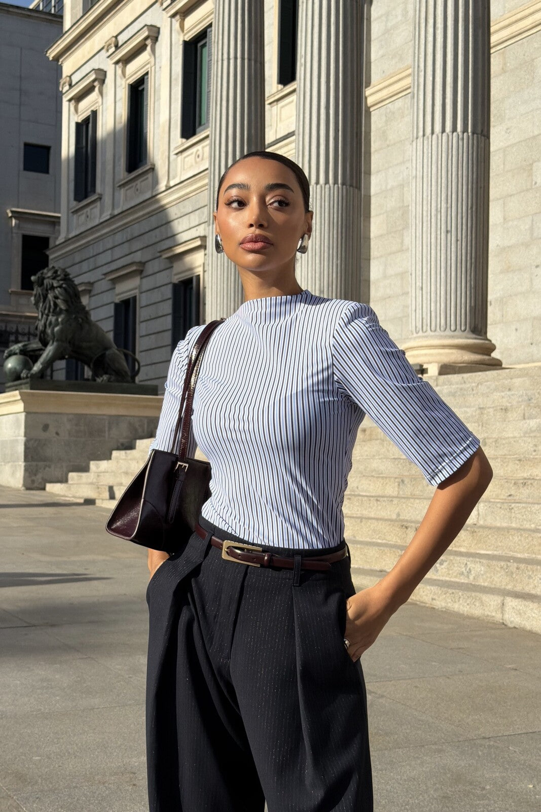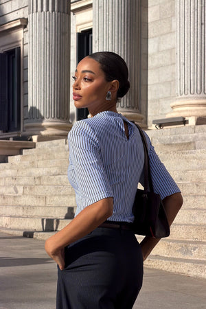 Sophisticated and minimalist, this top is the perfect blend of elegance and comfort. Featuring navy blue and white vertical stripes, it elongates the silhouette and conveys a modern, refined aesthetic. It has a delicate high neckline, short straight-cut sleeves, and a discreet button closure at the back, adding charm and practicality to the design. The fitted shape subtly enhances the figure, making it ideal for both professional outfits and more casual looks with a touch of sophistication.