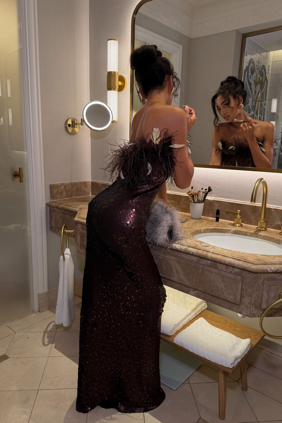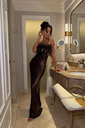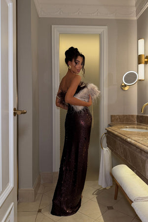 Exude glamour and sophistication with this stunning brown sequined vestido, perfect for special occasions and evening events. With a fitted cut that enhances the silhouette, the strapless design stands out for its luxurious detail of feathers and natural plumes at the neckline, adding a dramatic and elegant touch to the look. The fabric, embroidered with micro sequins, subtly reflects light, offering a refined sparkle. A striking piece that blends boldness and elegance for the woman who wants to be the center of attention.