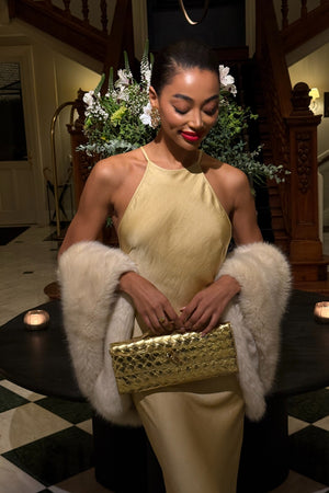 This gold long satin dress is a statement of sophisticated luxury, designed for women who seek a striking presence with timeless elegance. Its minimalist front design contrasts with the impactful back detail, where a delicate mesh of golden beads creates an exclusive pattern that enhances sensuality in a refined way. The fitted silhouette gently follows the feminine curves, while the satin fabric offers a subtle sheen and fluid movement. The thin straps and unlined back add visual lightness and freshness to the look, making it ideal for evening events and glamorous parties. The piece reflects a balance between classic and contemporary, perfect for those looking for a dress that combines quiet sophistication with eye-catching details.
