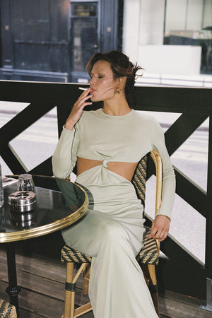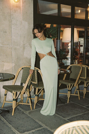 The green long dress with strategic cut-outs and a front knot detail is the ideal choice for women who appreciate elegance with a bold twist. The piece features a body-hugging silhouette that highlights the curves in a sophisticated way, with ankle-length hem. The knot detail at the front accentuates the waist, while the side cut-outs and subtle neckline create a modern and striking look. Made from comfortable fabric, this dress blends sensuality and class, making it perfect for evening events, parties, or special occasions that call for a standout presence. The long sleeves balance the look, making it versatile for different seasons. A timeless dress that combines minimalism and style, ideal for standout outfits with subtle or bold accessories.