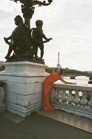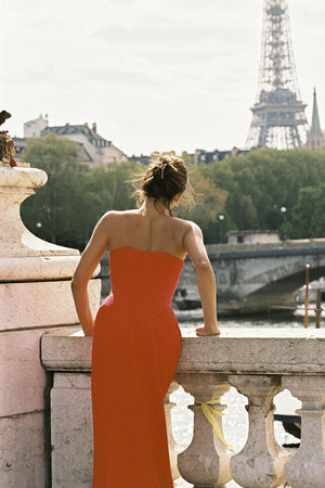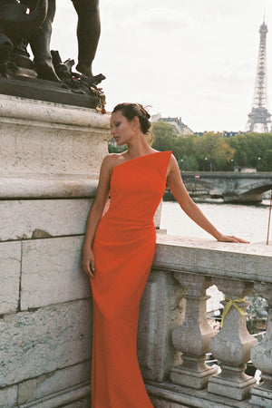 Refined minimalism meets timeless elegance in this asymmetrical red dress. Crafted from high-quality structured fabric, the design stands out with a single strap that elegantly highlights the shoulder line. The mermaid cut precisely outlines the silhouette, while the impeccable fit ensures a striking look. Perfect for formal occasions, this dress defines feminine power and sophistication. Pair it with long leather gloves for an iconic look.