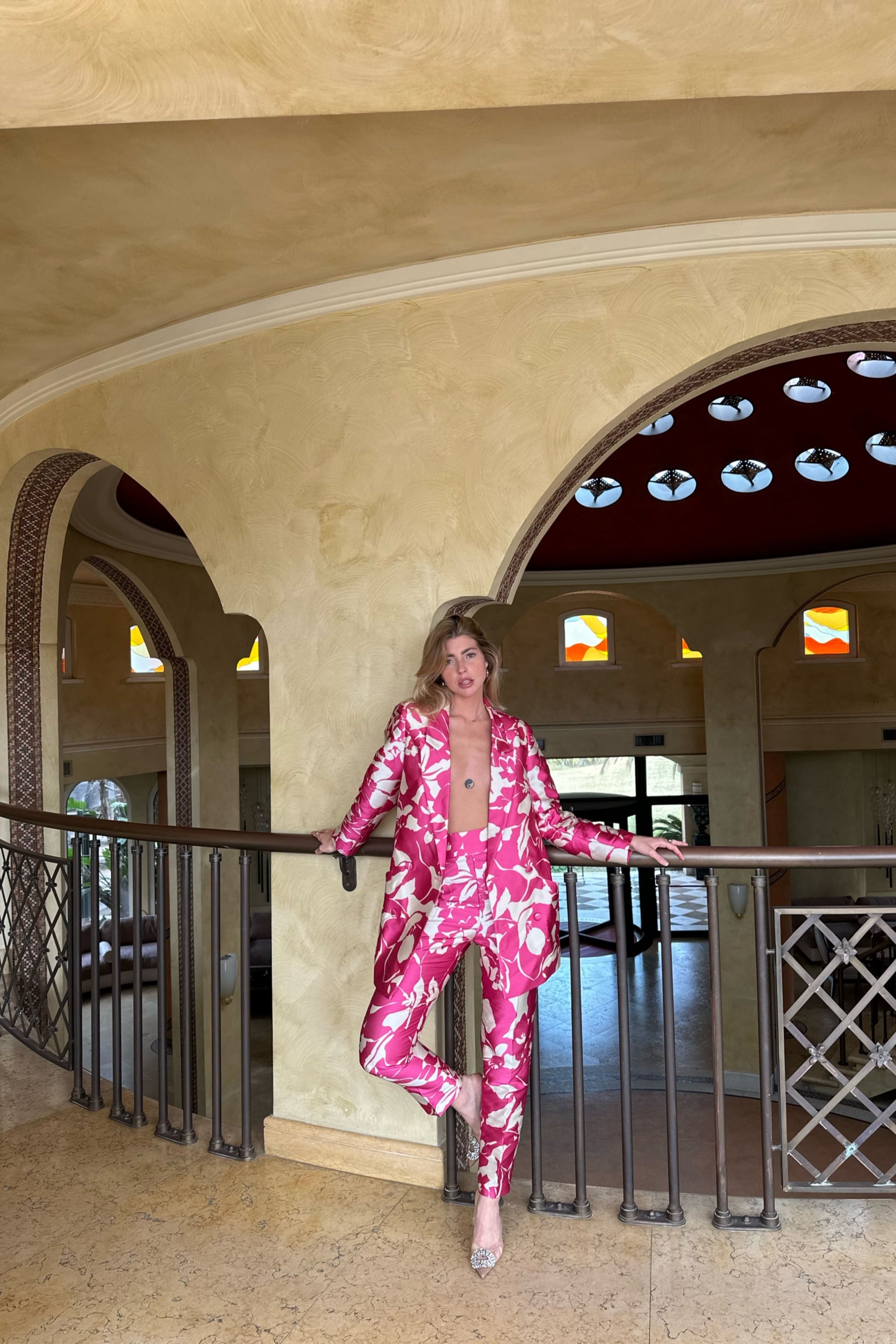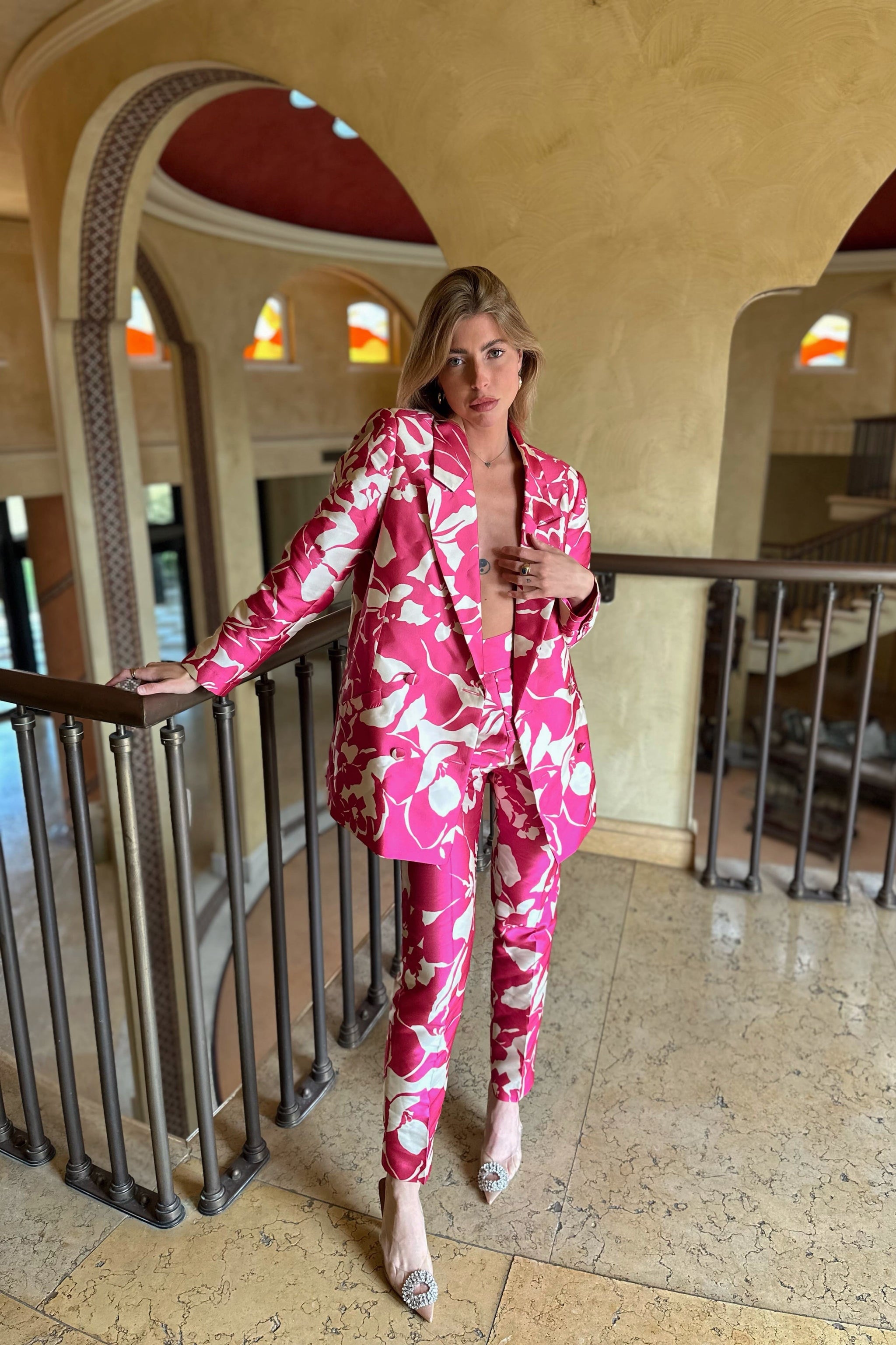 Pantalón fucsia con estampado jacquard floral beige con cintura alta, bolsillos laterales y detalle de pliegues en la parte delantera. Cierre de cremallera lateral. También puedes combinarlos con la chaqueta a juego.
