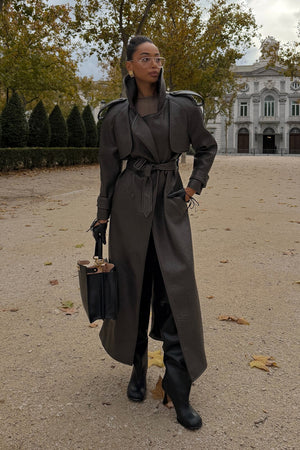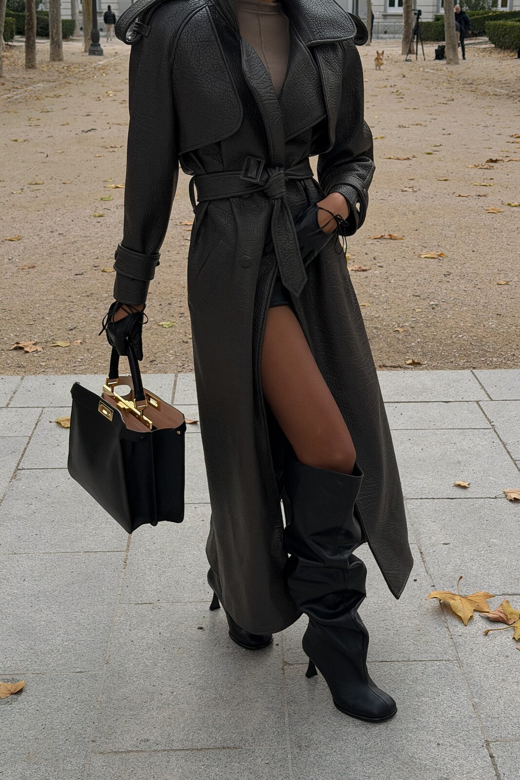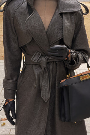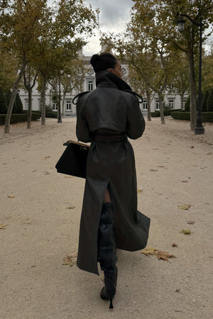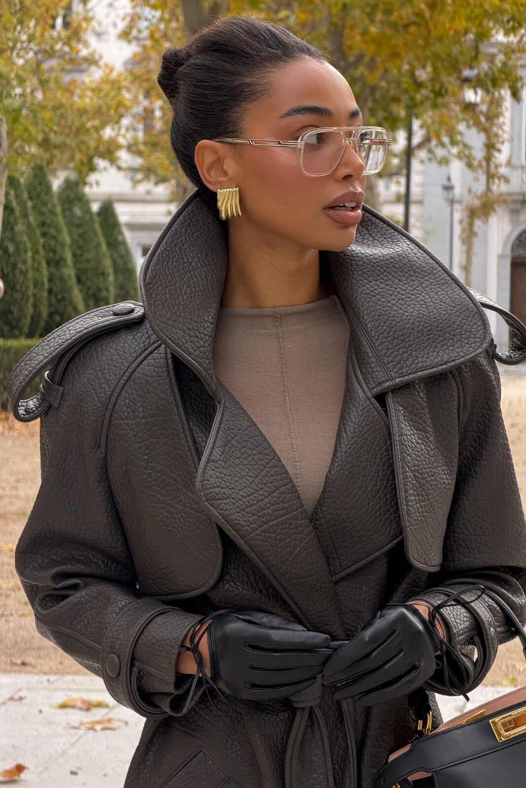 Gabardina gris con textura, cierre de cinturón y bolsillos laterales.