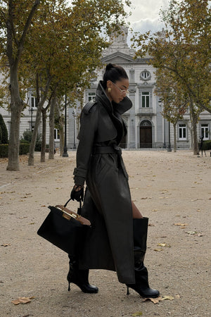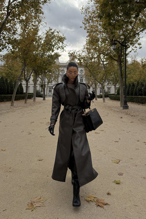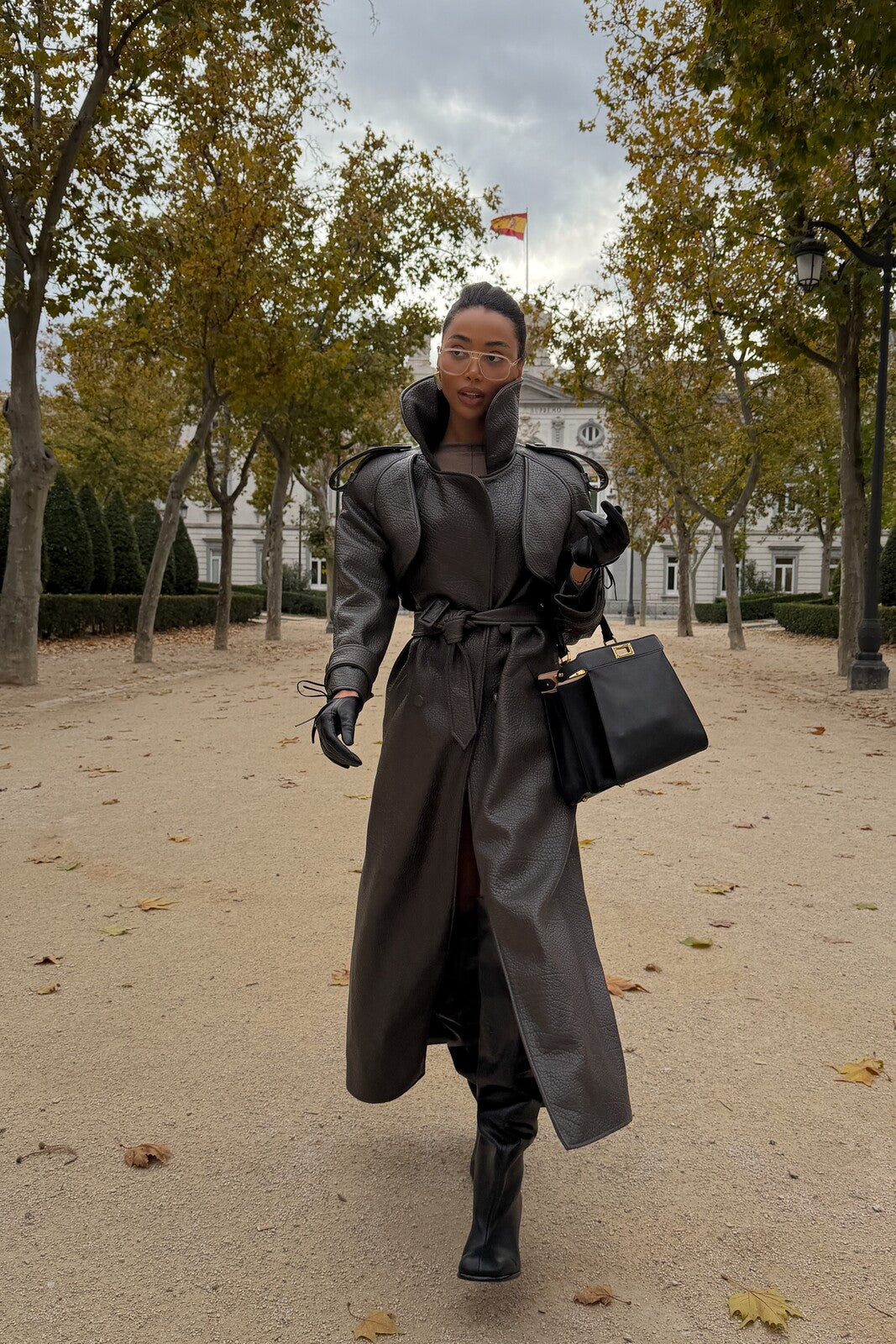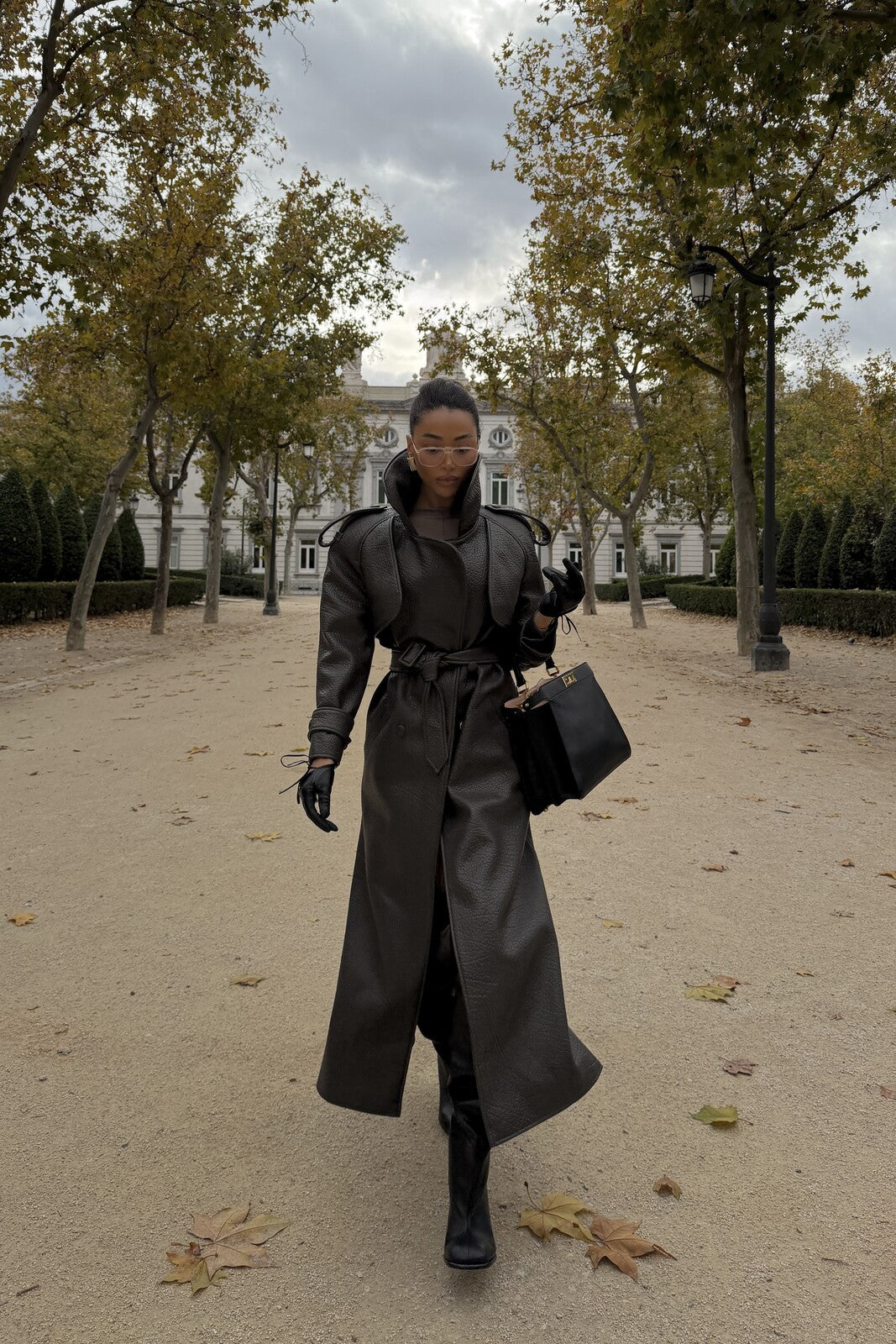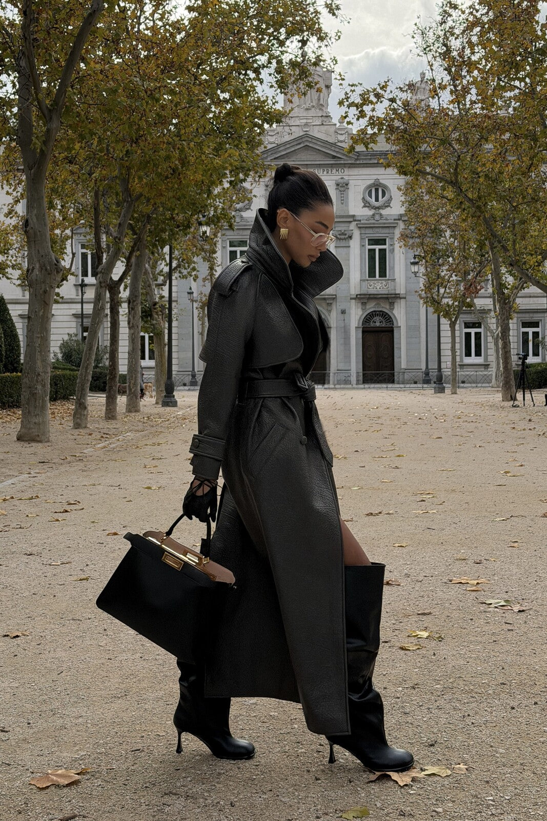 Gabardina gris con textura, cierre de cinturón y bolsillos laterales.