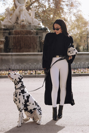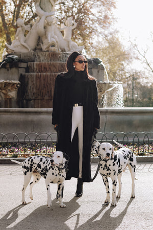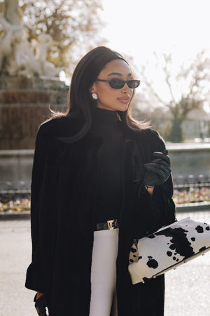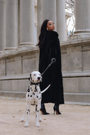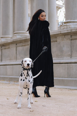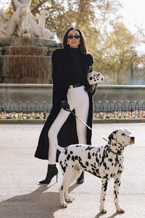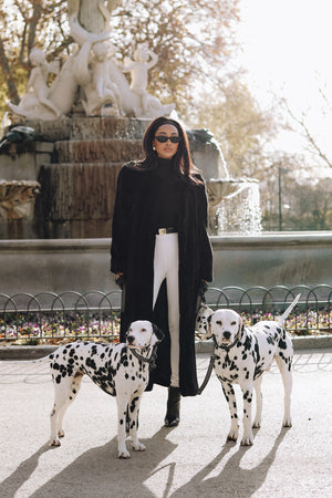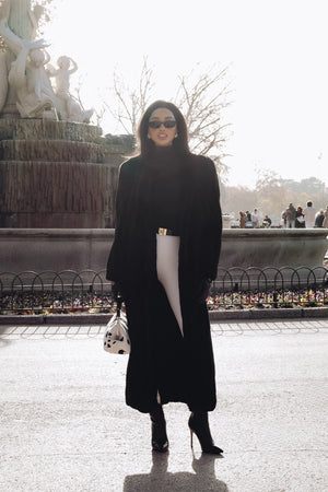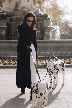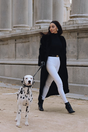 Elegancia atemporal con un toque dramático. Este abrigo largo de pelo negro, sin cuello, presenta un corte recto y fluido que alarga la silueta con sofisticación. La ausencia de cuello realza el diseño minimalista y moderno, mientras que el acabado lujoso aporta textura y refinamiento al conjunto. Ideal para ocasiones formales o para elevar looks urbanos con un toque de glamour clásico.