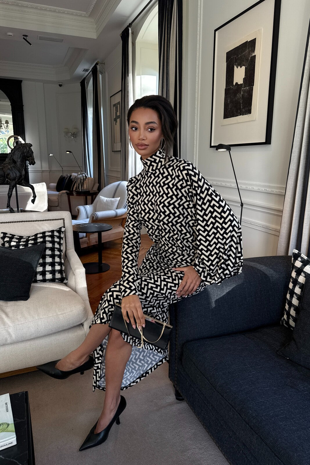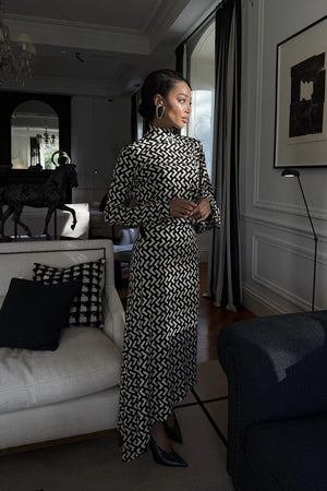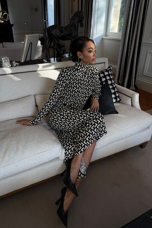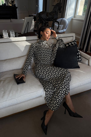 Vestido midi con corte asimétrico y estampado geométrico en blanco y negro que aporta sofisticación gráfica a la silueta. El modelo ajustado al cuerpo equilibra líneas clásicas con un toque moderno, gracias al cuello alto y las mangas largas con volumen sutil. El tejido fluido ofrece una caída elegante y un movimiento refinado, mientras que el largo irregular añade originalidad y dinamismo a la prenda. Una elección perfecta para ocasiones donde el estilo contemporáneo se encuentra con la elegancia atemporal. Ideal para mujeres que valoran el diseño, el arte y la moda con identidad.