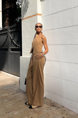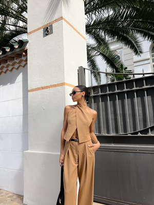 Un toque de sofisticación moderna en una silueta minimalista. Este top camel presenta un diseño halter elegante con drapeado frontal que crea un efecto cruzado favorecedor en el escote. El corte estructurado y el acabado fluido le aportan un aire pulido y contemporáneo, ideal para combinar con pantalones de sastrería o faldas midi en looks elegantes y sin esfuerzo.