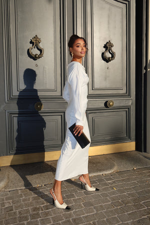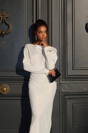 Vestido blanco largo confeccionado en un tejido ligero y sofisticado, con un ajuste impecable. Presenta un elegante escote barco que realza la silueta y mangas largas que aportan un toque refinado. El corte minimalista y entallado garantiza un look atemporal y sofisticado, ideal para ocasiones especiales y eventos nocturnos.