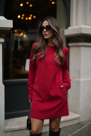 Robe courte rouge à manches longues avec fermeture éclair invisible dans le dos. Robe avec encolure haute et poches latérales. Cette robe sophistiquée est idéale pour les événements spéciaux.