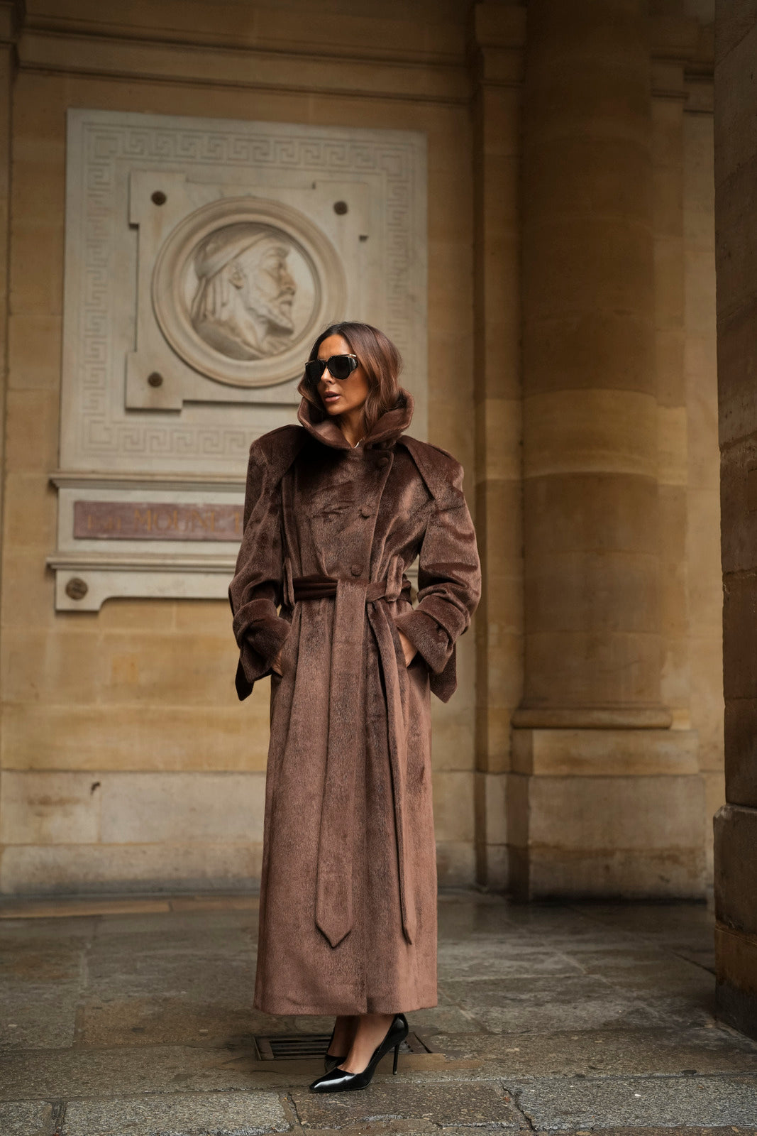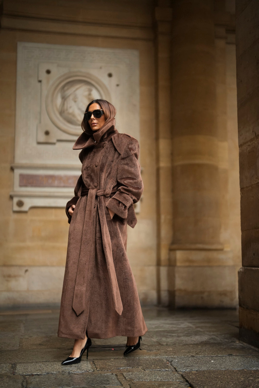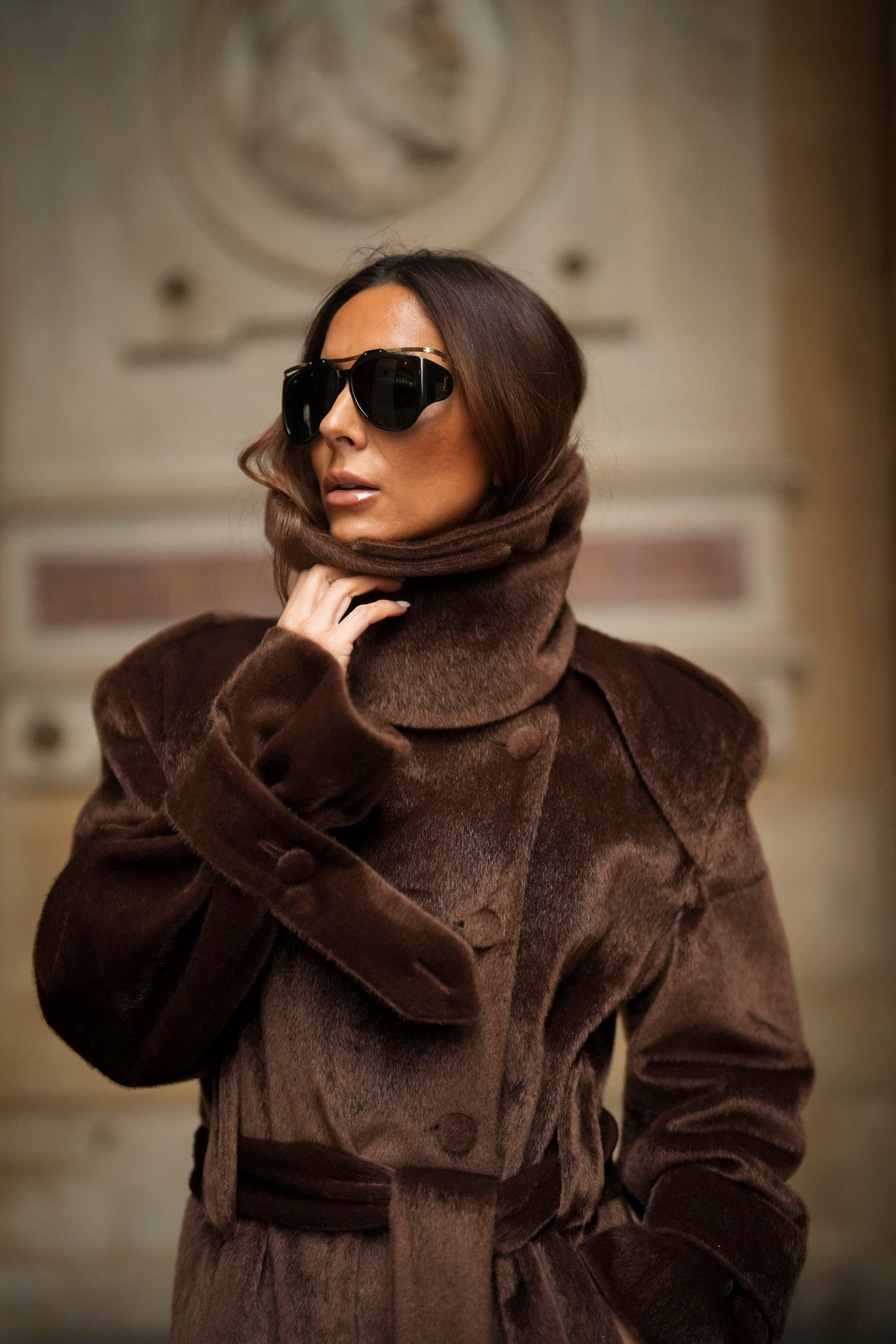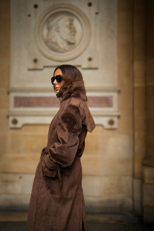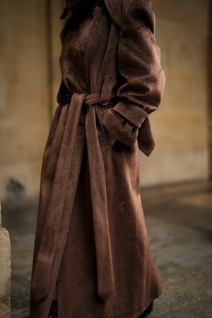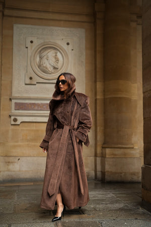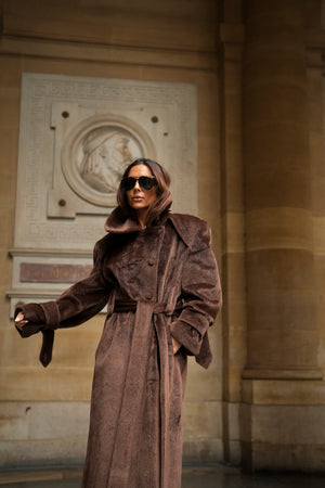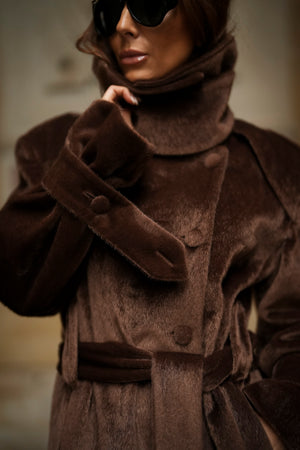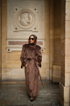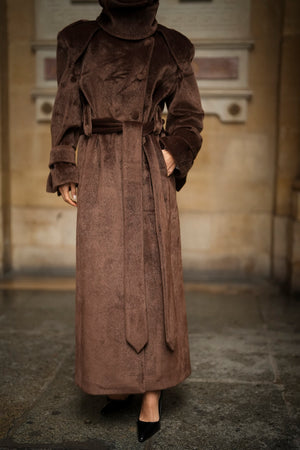 Soprabito lungo in lana rasata marrone, con una texture morbida e lussuosa. Il design strutturato si distingue per il colletto ampio e voluminoso, che dona un aspetto imponente ed elegante. La silhouette è definita da una cintura in tessuto coordinato, regolabile in vita, e bottoni rivestiti abbinati. I polsini larghi con fiocco e le spalle marcate completano questo capo di alta sofisticazione. Ideale per un inverno elegante e ricco di stile.