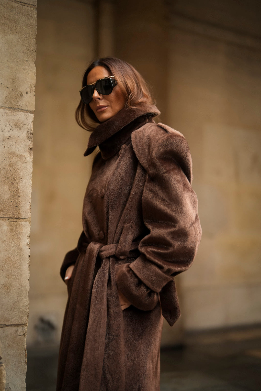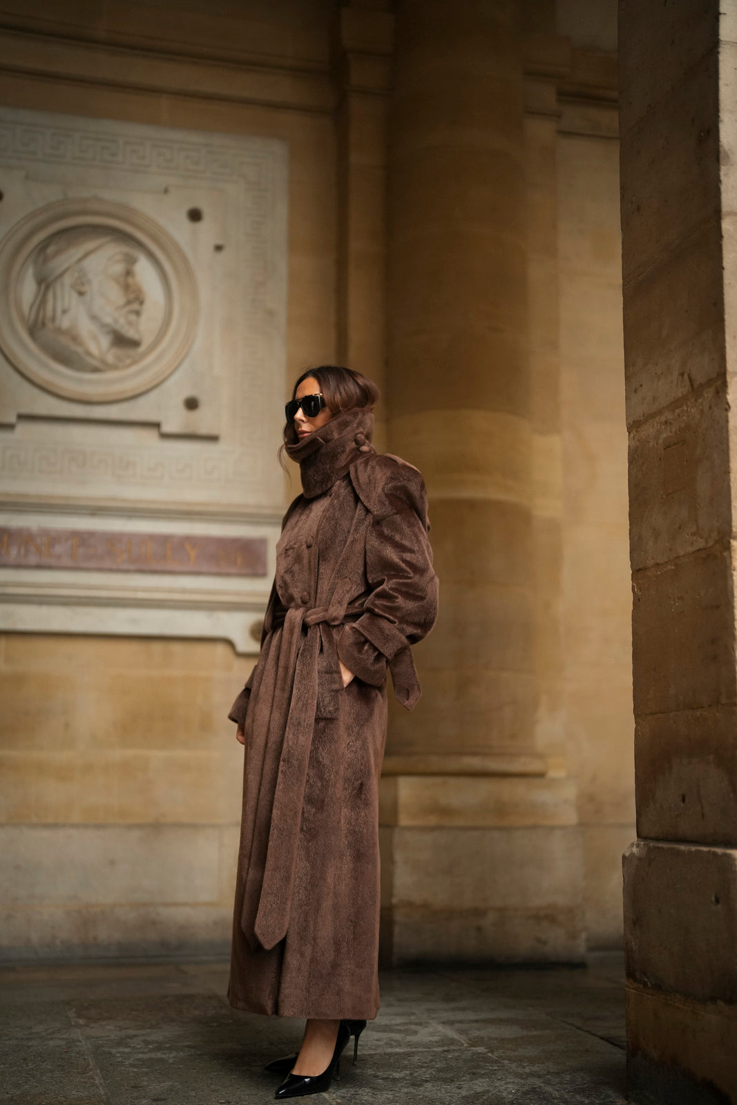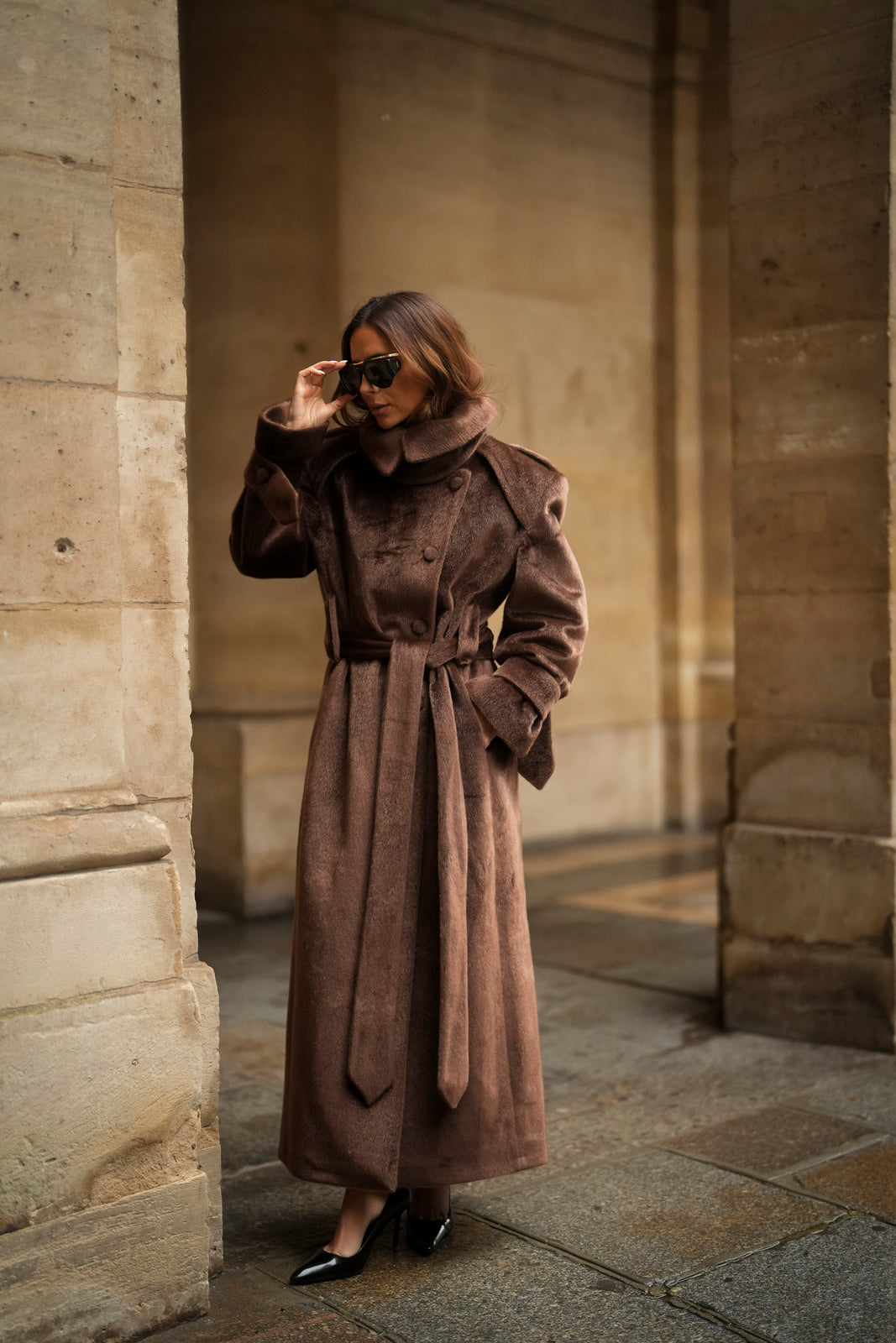 Soprabito lungo in lana rasata marrone, con una texture morbida e lussuosa. Il design strutturato si distingue per il colletto ampio e voluminoso, che dona un aspetto imponente ed elegante. La silhouette è definita da una cintura in tessuto coordinato, regolabile in vita, e bottoni rivestiti abbinati. I polsini larghi con fiocco e le spalle marcate completano questo capo di alta sofisticazione. Ideale per un inverno elegante e ricco di stile.