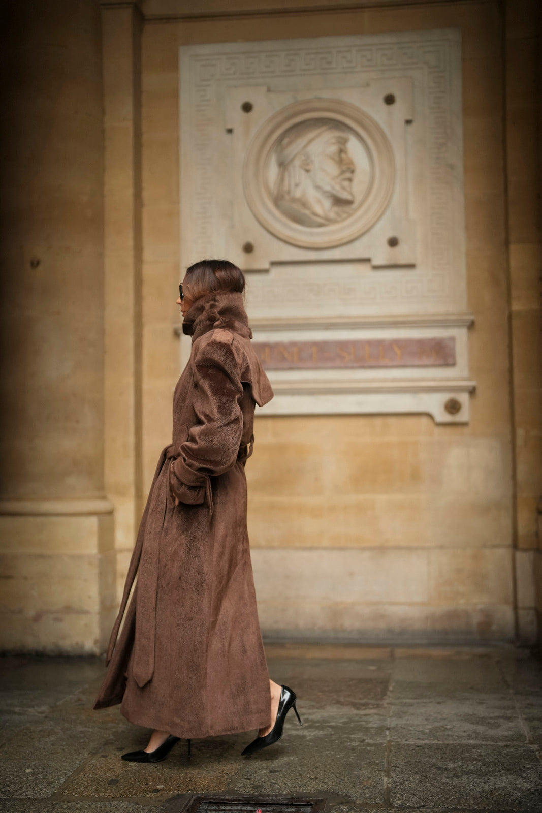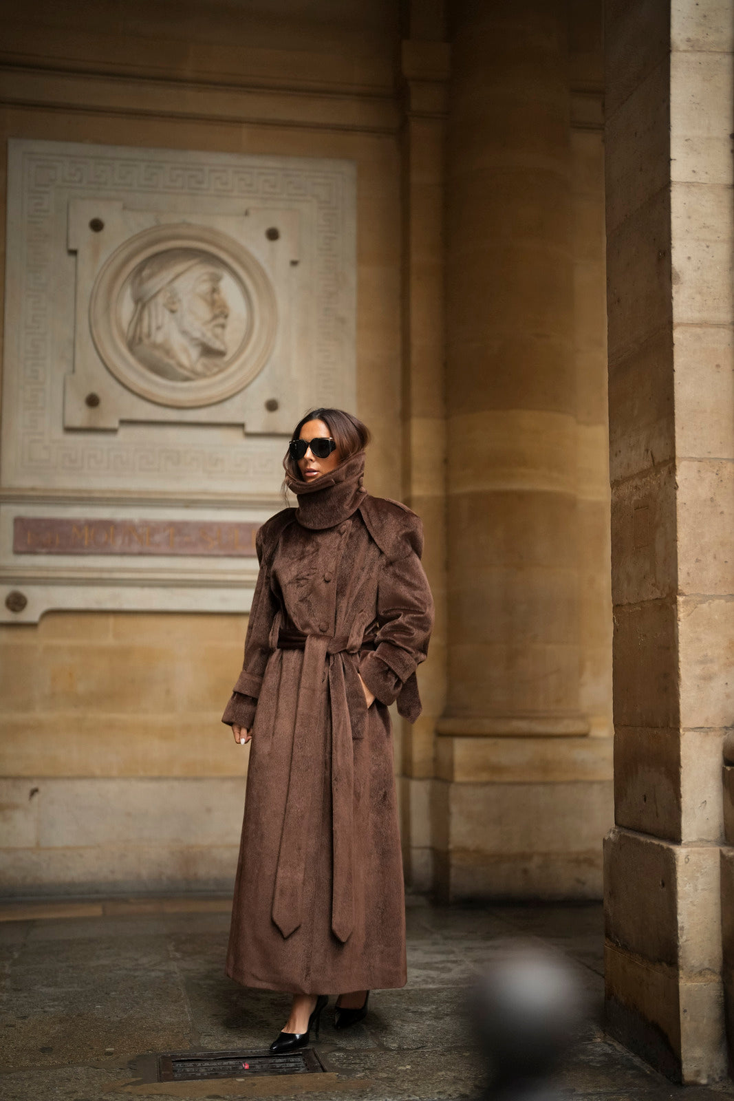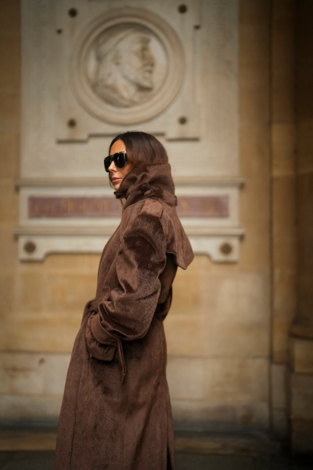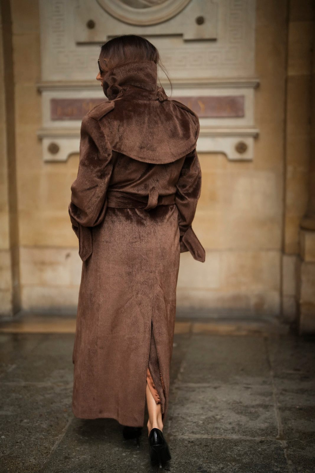 Soprabito lungo in lana rasata marrone, con una texture morbida e lussuosa. Il design strutturato si distingue per il colletto ampio e voluminoso, che dona un aspetto imponente ed elegante. La silhouette è definita da una cintura in tessuto coordinato, regolabile in vita, e bottoni rivestiti abbinati. I polsini larghi con fiocco e le spalle marcate completano questo capo di alta sofisticazione. Ideale per un inverno elegante e ricco di stile.