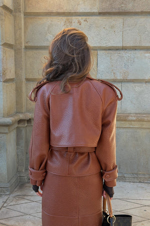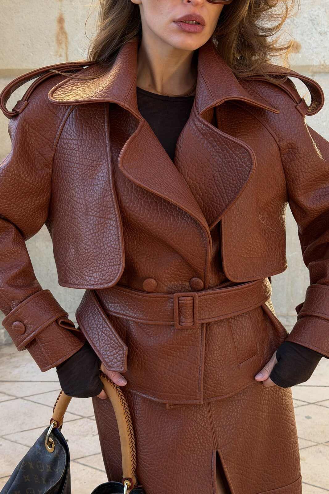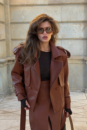 Il trench corto piastrella reinterpreta con audacia e raffinatezza il classico trench coat. Con la sua texture decisa e il taglio strutturato, è il capo statement perfetto per donne che vogliono trasmettere forza, eleganza e modernità. La cintura in tinta segna il punto vita e bilancia la silhouette, mentre le spalle strutturate e le ampie revers aggiungono un tocco imponente. Ideale da abbinare a bermuda in pelle, gonne a tubino o pantaloni sartoriali.