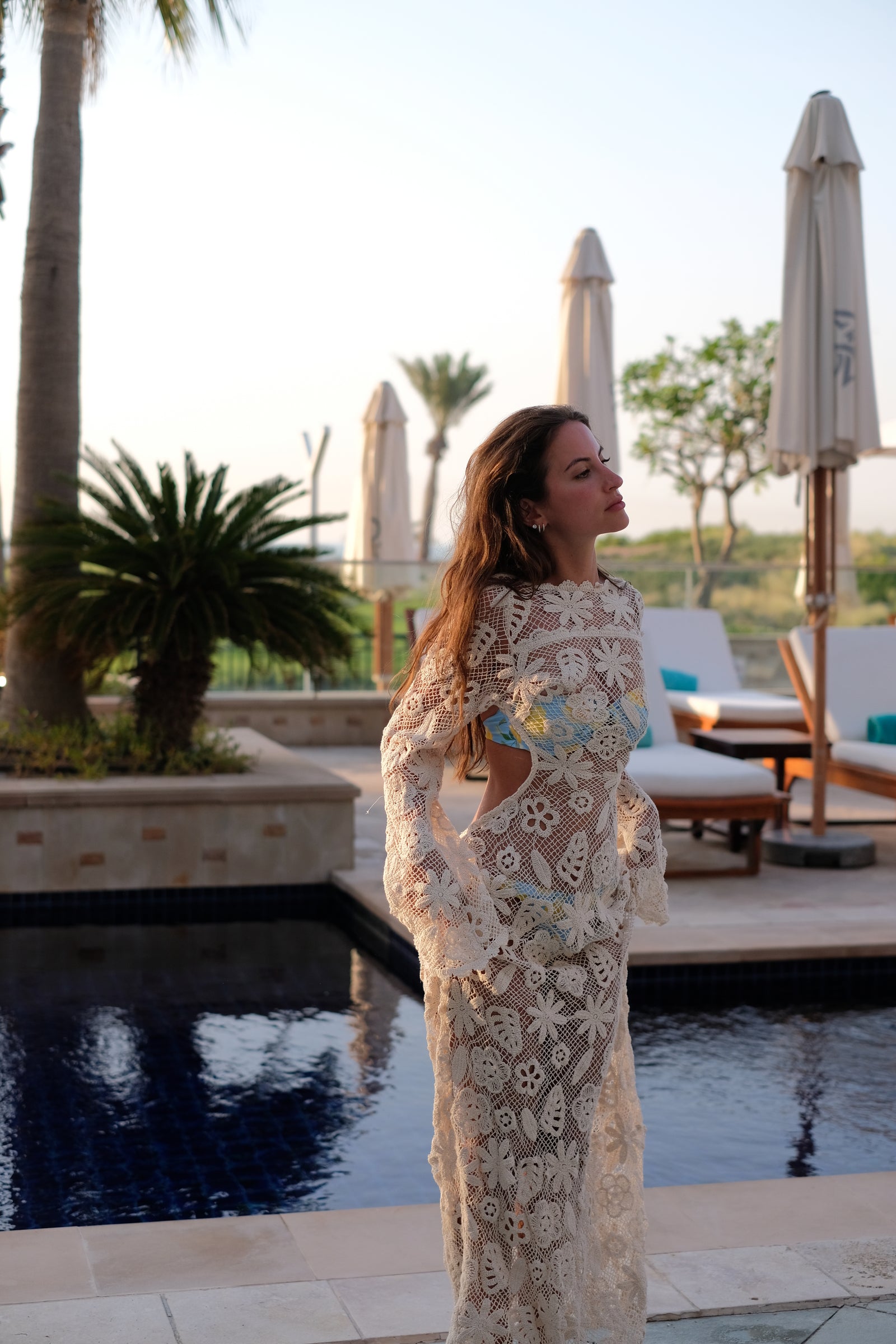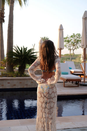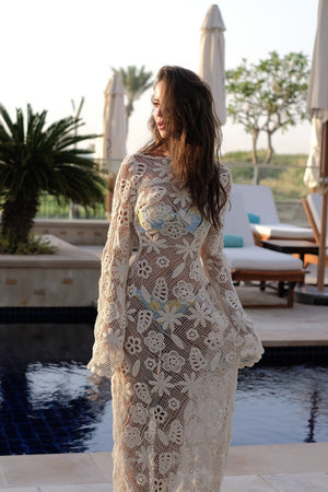 Vestito lungo in maglia beige che combina eleganza artigianale con un tocco sofisticato di sensualità. Realizzato in pizzo floreale traforato, presenta maniche lunghe ampie e una vestibilità fluida che avvolge il corpo con leggerezza. Il design rivela delicatamente la silhouette, creando un look raffinato e contemporaneo, ideale per momenti esclusivi in riva al mare o in resort di lusso. Un capo versatile e distintivo, perfetto per chi cerca sofisticazione con ispirazione naturale e una finitura delicata.