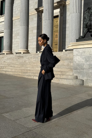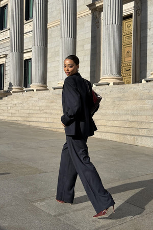 Estas calças de alfaiataria azul-marinho elevam o clássico com um toque contemporâneo e sofisticação atemporal. Apresentam um corte de cintura média e caimento reto e fluido que alonga a silhueta. O design conta com pregas frontais marcadas, bolsos laterais funcionais e acabamento impecável, reforçando a elegância da peça. Um essencial versátil para coordenar com blazers estruturados ou camisas refinadas, ideal para compor looks de trabalho ou produções urbanas de luxo