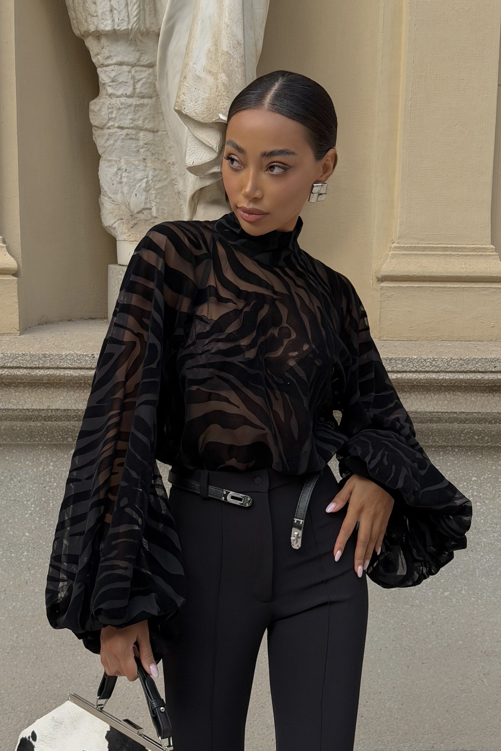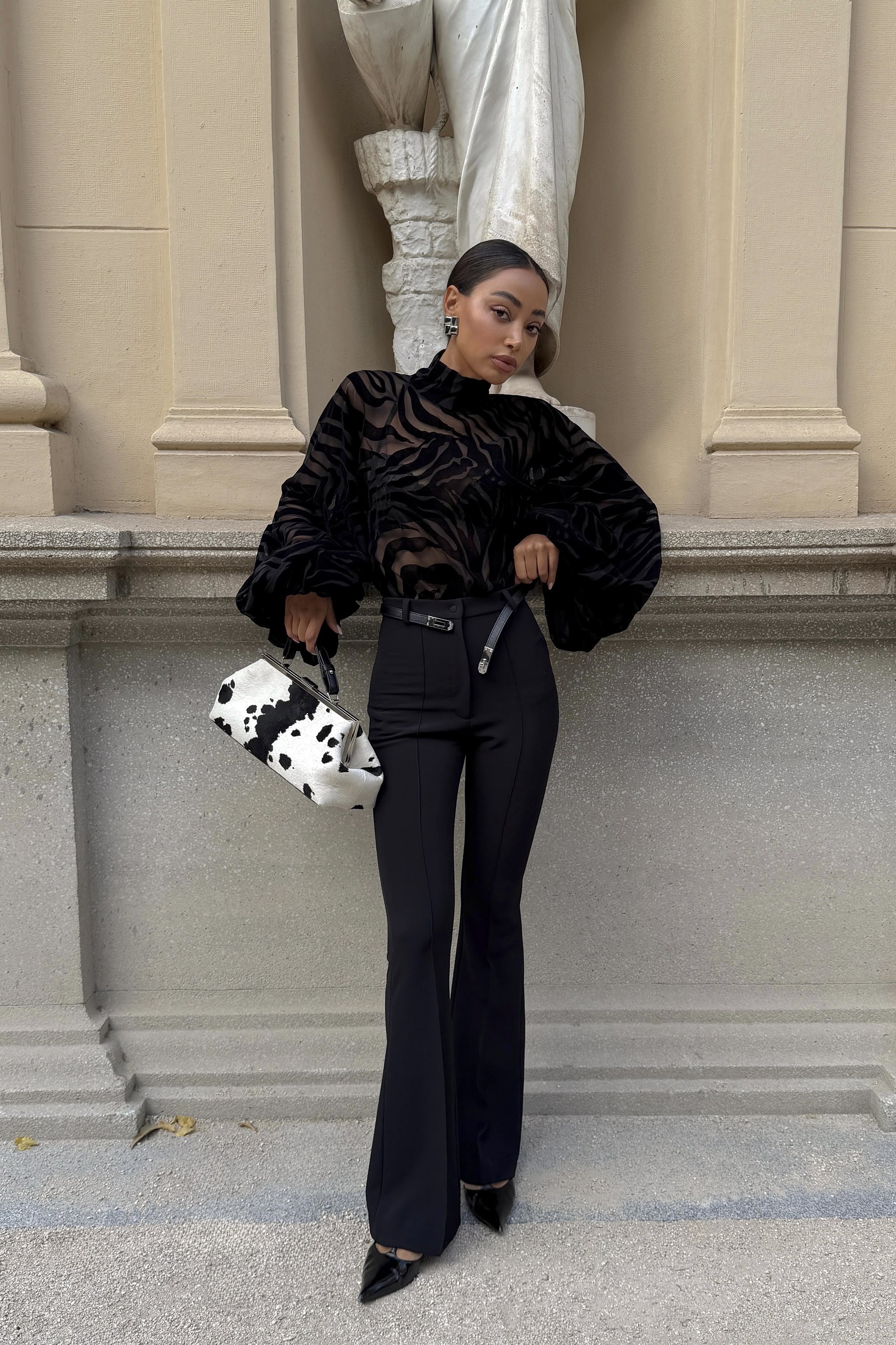 As nossas calças pretas de corte flare elevam qualquer coordenado com uma silhueta elegante e intemporal. Confeccionadas num tecido estruturado e confortável, apresentam cintura subida, perna justa até ao joelho e abertura gradual até à bainha, criando um efeito alongador perfeito. O design minimalista permite inúmeras combinações — desde blusas sofisticadas a básicos do dia a dia — tornando-as uma peça versátil para looks de trabalho ou ocasiões especiais. Uma escolha moderna, feminina e extremamente lisonjeira.