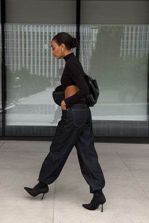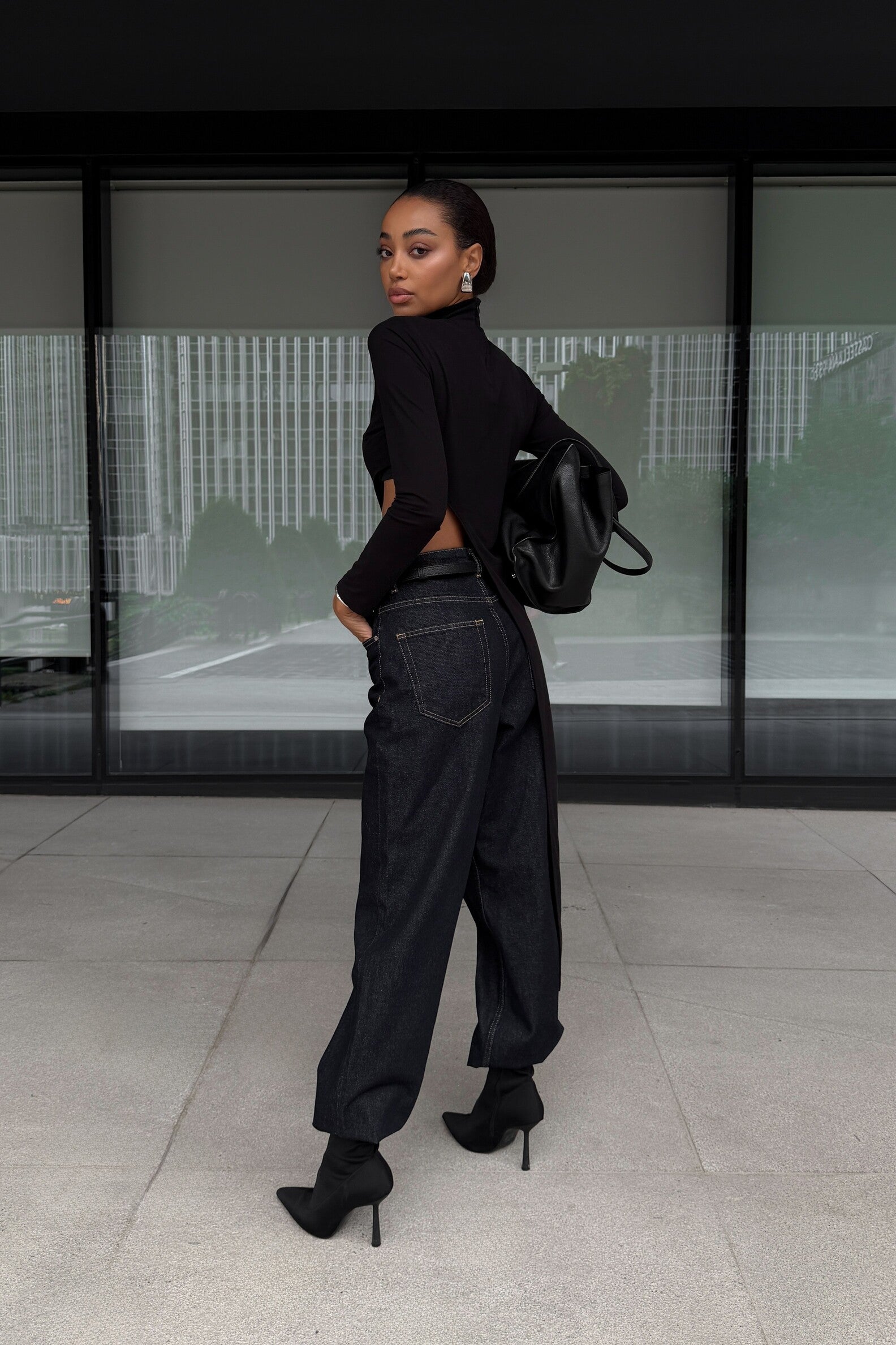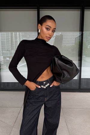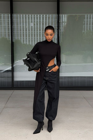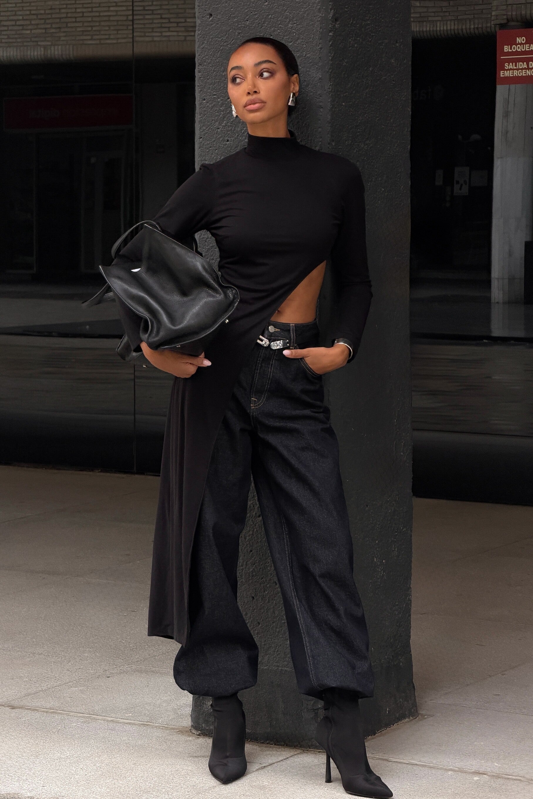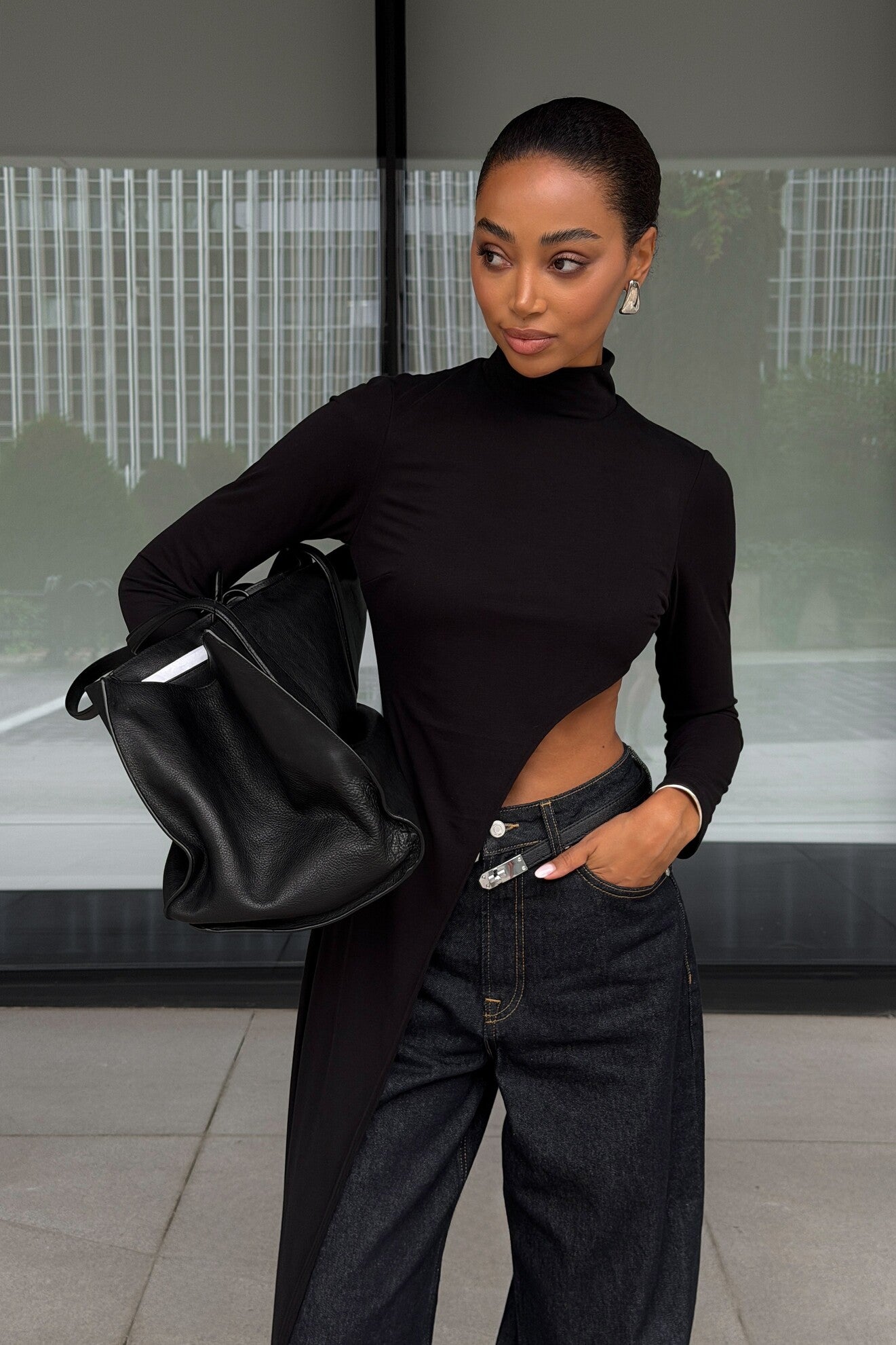 Esta camisola preta de gola alta destaca-se pelo seu design assimétrico e recorte lateral, revelando subtilmente a silhueta e criando um equilíbrio perfeito entre estrutura e fluidez. Confeccionada num tecido elástico e confortável, adapta-se ao corpo com leveza, proporcionando um visual contemporâneo e sofisticado — ideal para quem procura uma peça versátil com caráter e presença.