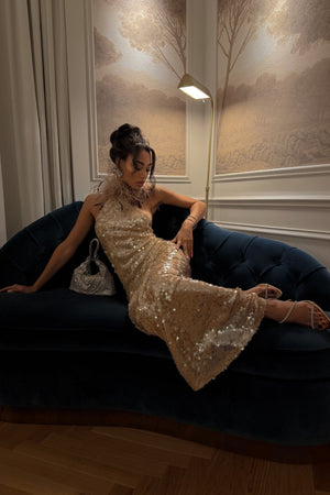 Deslumbre com sofisticação e brilho neste vestido longo dourado, inteiramente coberto por lantejoulas que captam a luz com cada movimento. A silhueta justa realça elegantemente as curvas, enquanto a gola alta adornada com plumas confere um toque de glamour e drama irresistível. Com costas abertas em corte profundo e fecho discreto, este modelo é ideal para ocasiões especiais onde a elegância e o impacto visual são essenciais. Uma peça statement que alia luxo, feminilidade e sofisticação com mestria.