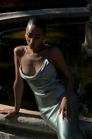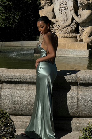 Vestido longo verde água com alças finas cruzadas nas costas e decote drapeado. Confeccionado em tecido acetinado de caimento leve e sofisticado, valoriza a silhueta com elegância e fluidez. Ideal para eventos especiais e produções noturnas, une sensualidade e sofisticação em um design atemporal.
